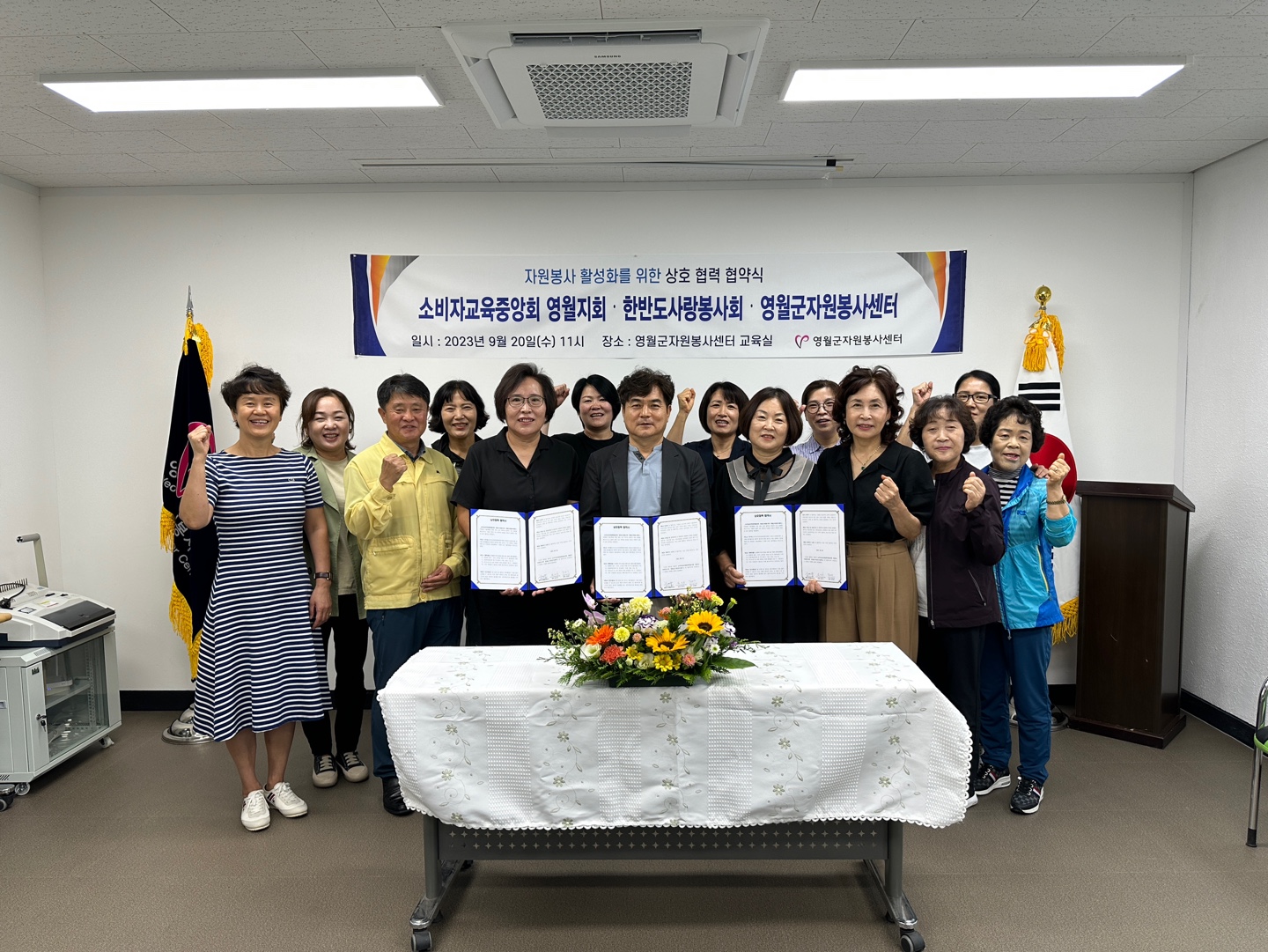 [강원사회복지신문 최재석 기자]=영월군자원봉사센터(센터장 직무대행 최영수)는 지난 9월 20일 수요일 11시에 소비자교육중앙회영월지회(회장: 김미자), 한반도사랑봉사회(회장:김정애) 봉사단체 상호 협력 협약식을 진행했다. 협약식에는 이동숙 철쭉회 회장, 양희용 한반도면장, 소비자교육중앙회 영월지회와 한반도사랑봉...