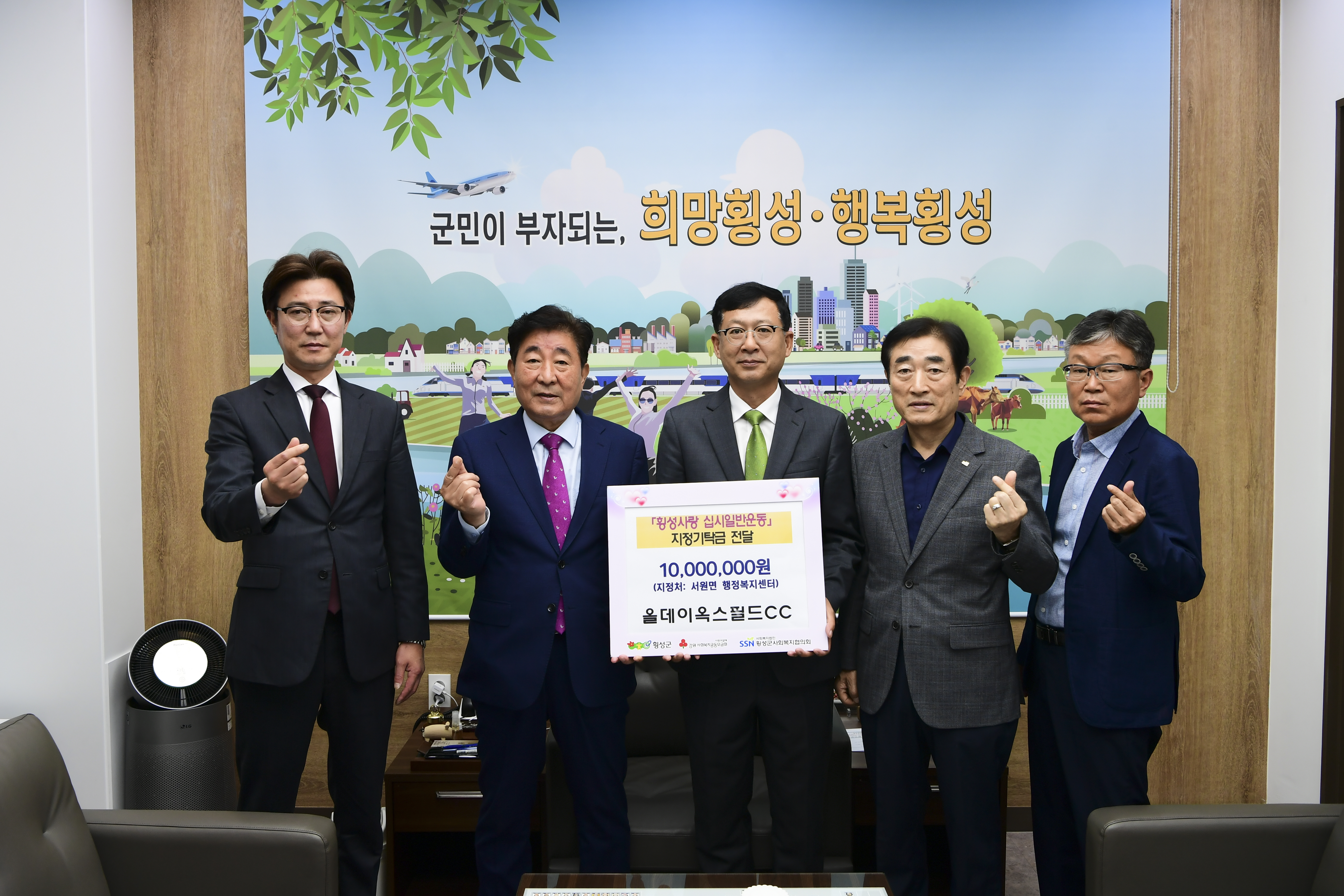 [강원사회복지신문 홍기한 기자]=올데이골프그룹의 옥스필드CC(대표 최창호)는 지난 9월 20일 9시 50분 횡성군수 집무실에서 '횡성사랑 십시일반운동'에 동참하는 의미에서 1,000만원을 서원면에 지정기탁하였다.
