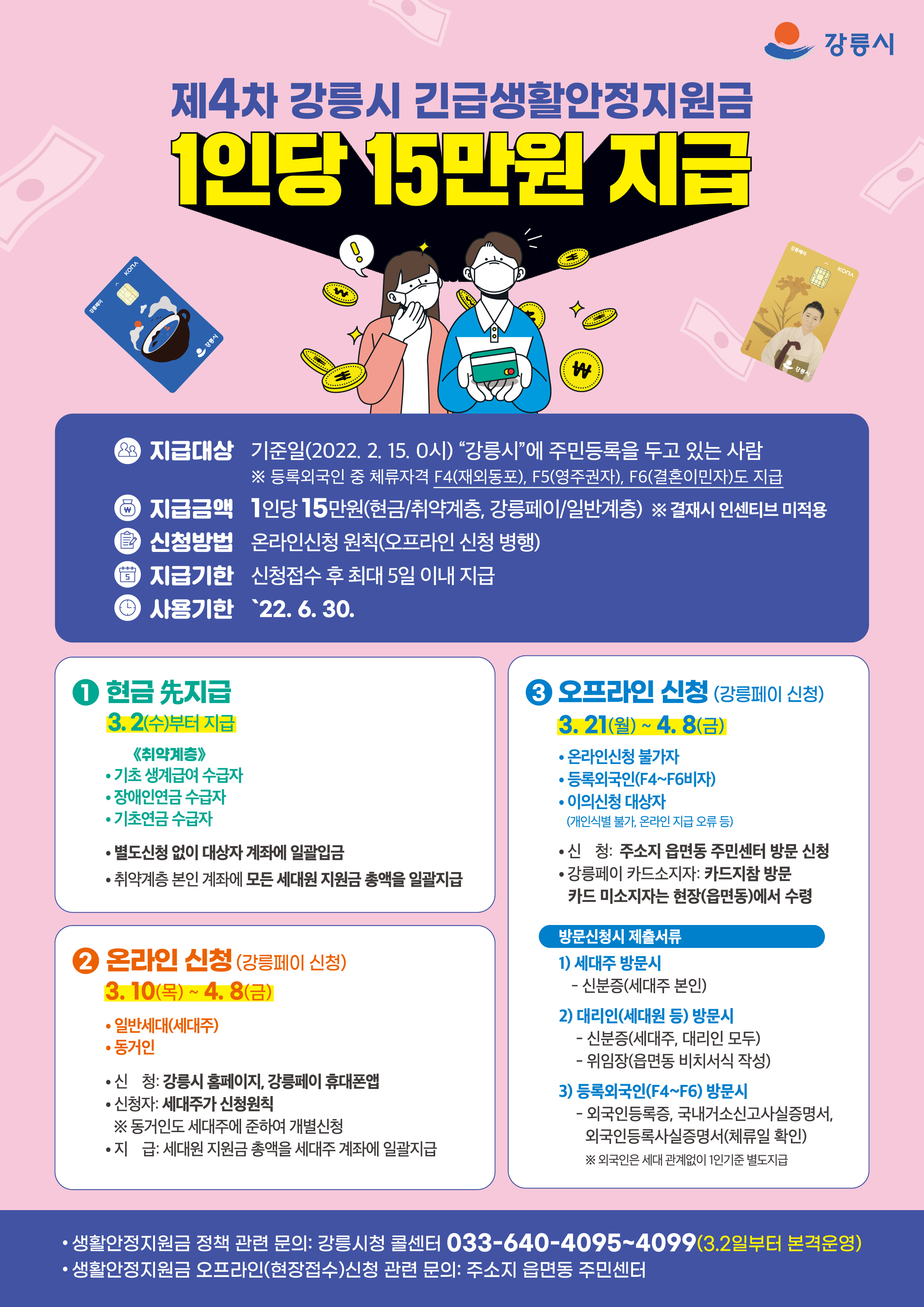 [강원사회복지신문 서은진 기자]=취약계층 현금 선지급, 3월 10일부터 일반가구 온라인 신청 강릉시는 코로나19로 어려움을 겪는 시민들의 생계지원 및 침체된 지역경제 활성화를 위한 '강릉시 4차 긴급생활안정지원금' 신청 접수를 오는 3월 10일(목)부터 4월 8일(금)까지 추진한다. 지급대상은 2022년 2월 15일 0시 현재 강...