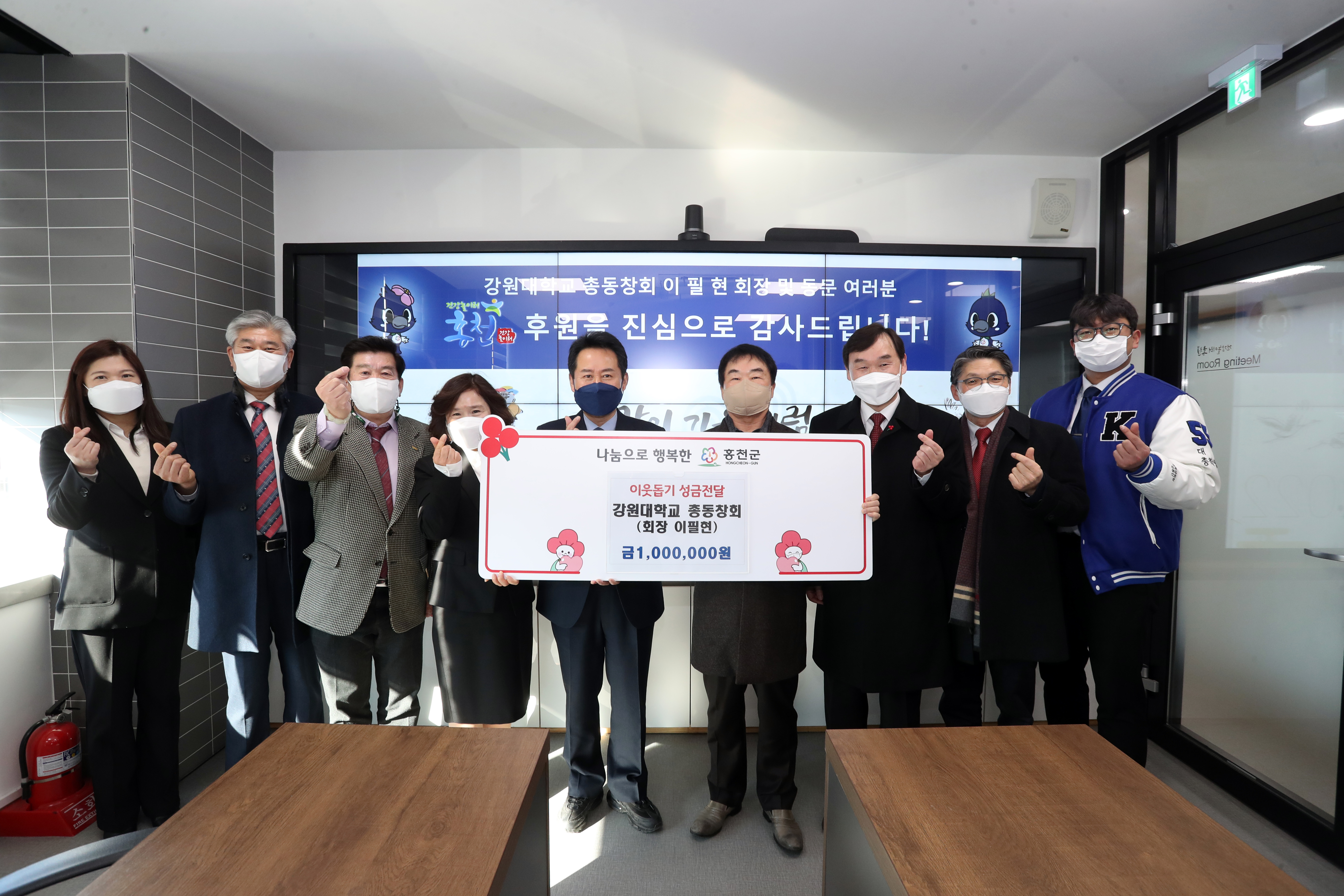 [강원사회복지신문 서은진 기자]=강원대학교 총동창회는 지난 2월 23일 홍천군청을 방문, 이웃돕기 성금 100만원을 기탁했다. 강원대학교 총동창회(회장 이필현)와 총학생회(회장 김용신)는 "홍천지역 주민들에게 도움이 되고 싶다"며 지역사회 공헌 모토인 'KNU with YOU'의 일환으로 성금을 전달했다. 허필홍 홍천군수는 "...