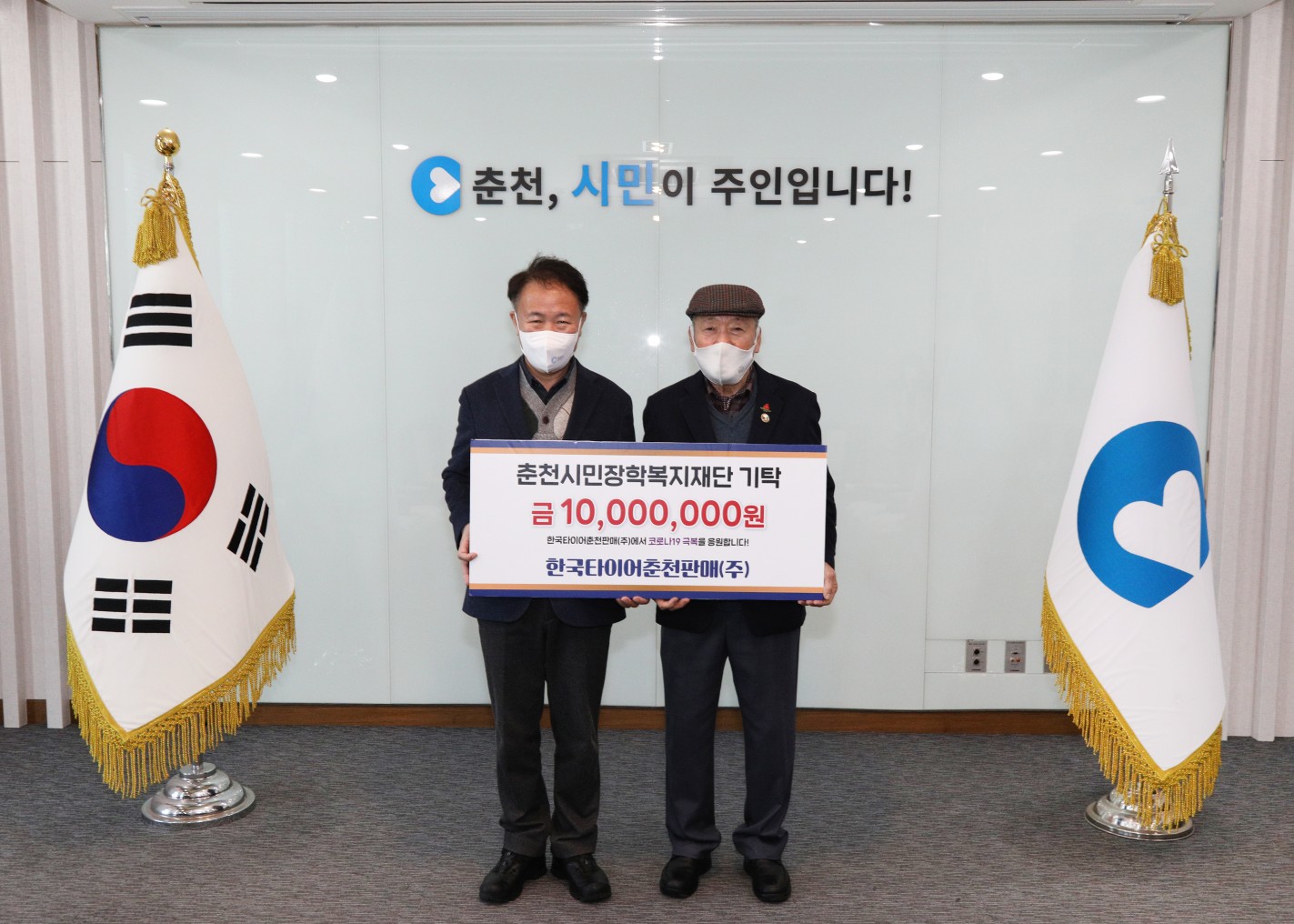[강원사회복지신문 홍기한 기자]=(주)한국타이어춘천판매(회장:임기수)는 지난 2월 18일 접견실에서 춘천시민장학복지재단에 1,000만원을 기탁했다.