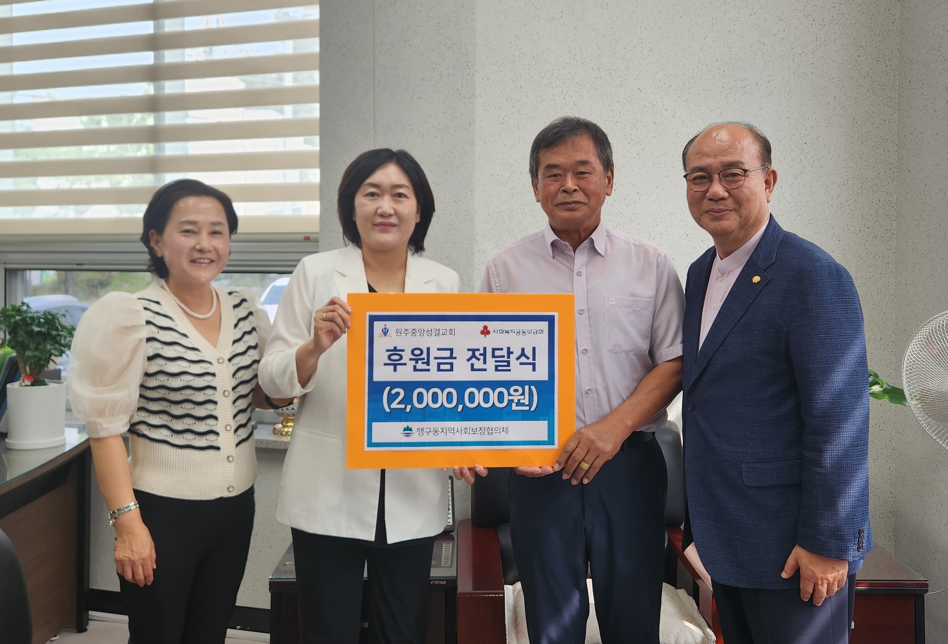 [강원사회복지신문 최재석 기자]=원주중앙성결교회(담임목사 정덕균)는 지난 9월 19일 원주시 행구동지역사회보장협의체(공동위원장 강순예, 박영아)에 현금 200만 원을 지정기탁하고, 140만 원 상당의 쌀과 양념육, 과일을 경로당 9개소에 전달했다.