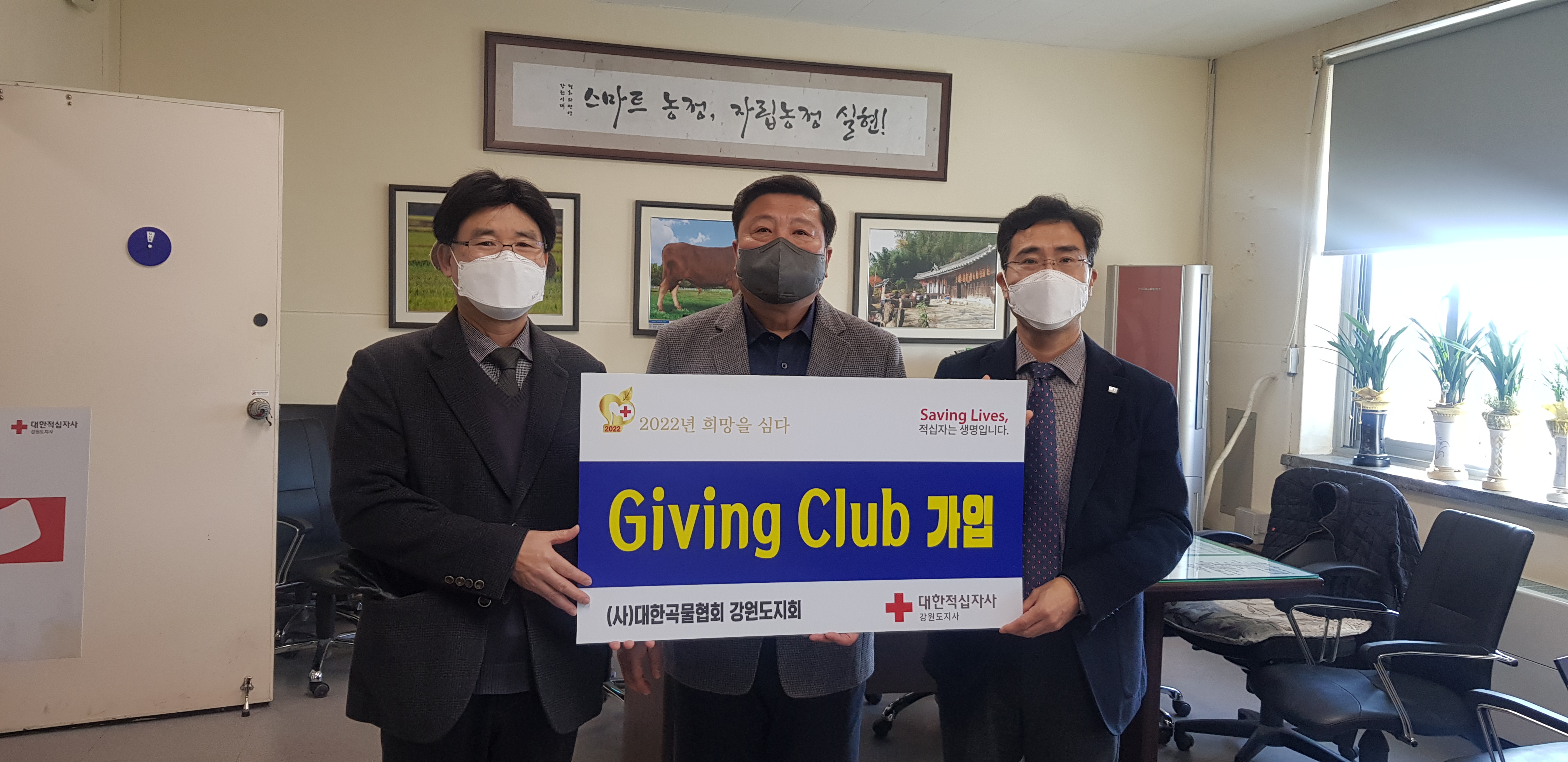 [강원사회복지신문 홍기한 기자]=연일 코로나가 확산되는 가운데 (사)대한곡물협회 강원도지회(지회장 : 함상옥)는 지난 2월 16일 강원도청에서 도내 코로나19 피해지역의 의료진, 환자 등의 구호물품 지원을 위한 구호성금 삼백만원을 대한적십자사 강원지사에 기탁하면서 Giving Club에 가입했다. 행사에는 김복진 농정국장...