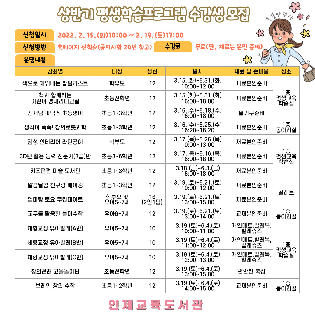 [강원사회복지신문 홍기한 기자]=인제교육도서관(관장 최복진)은 평생학습의 기회와 삶의 질 향상을 위한 2022년 상반기 평생학습프로그램 수강생을 모집한다. 이번 평생학습프로그램은 학부모, 학생, 유아 대상으로 총 15개 강좌를 운영할 예정이다. 학생 대상으로는 △창의 전래 고을 놀이터 △ 책과 함께하는 어린이 경제...