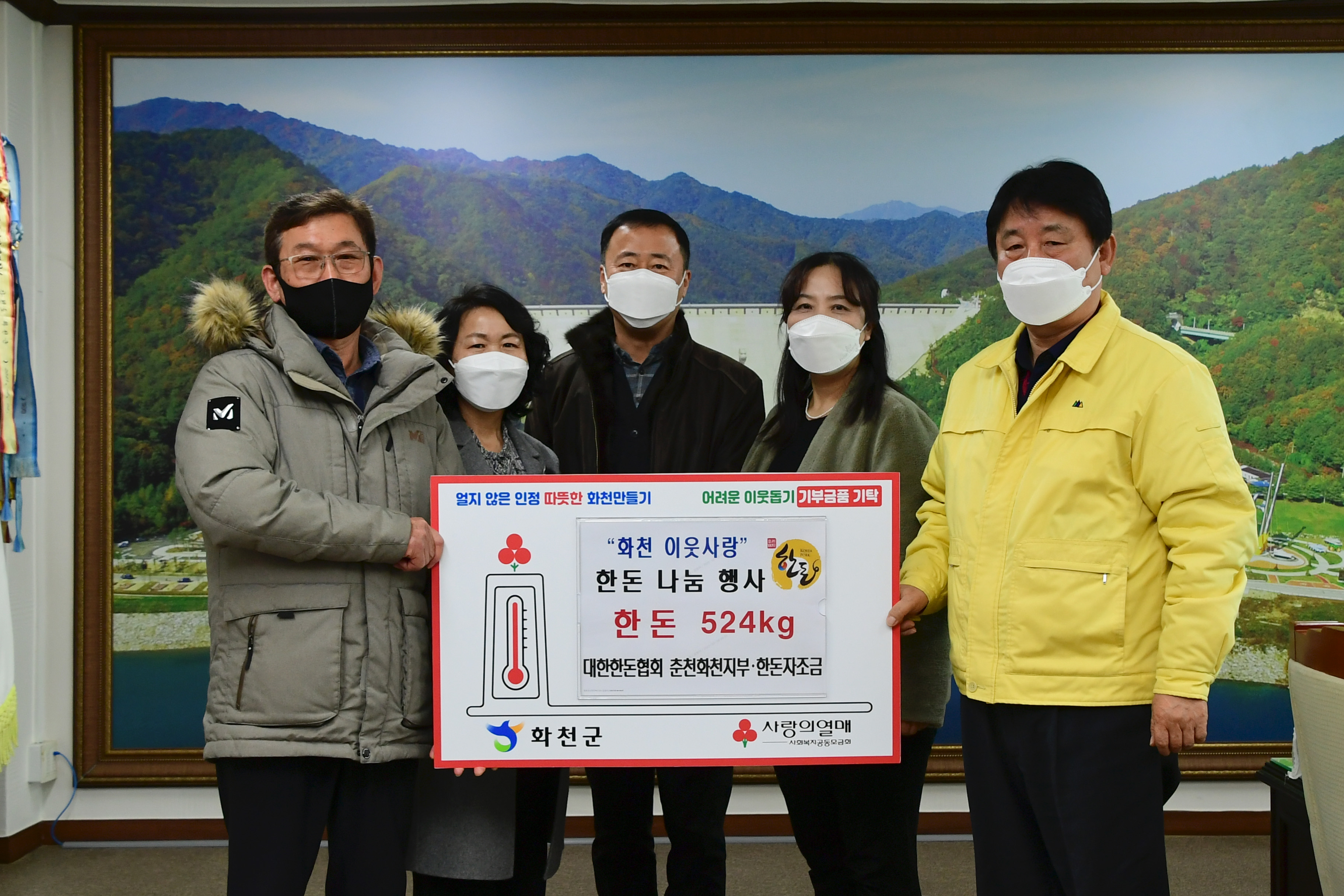 [강원사회복지신문 홍기한 기자]=대한한돈협회 춘천화천지부(지부장:최기해)는 지난 2월 8일 최문순 화천군수를 방문해 어려운 이웃들에게 전달해 달라며 한돈 524kg을 기탁했다.