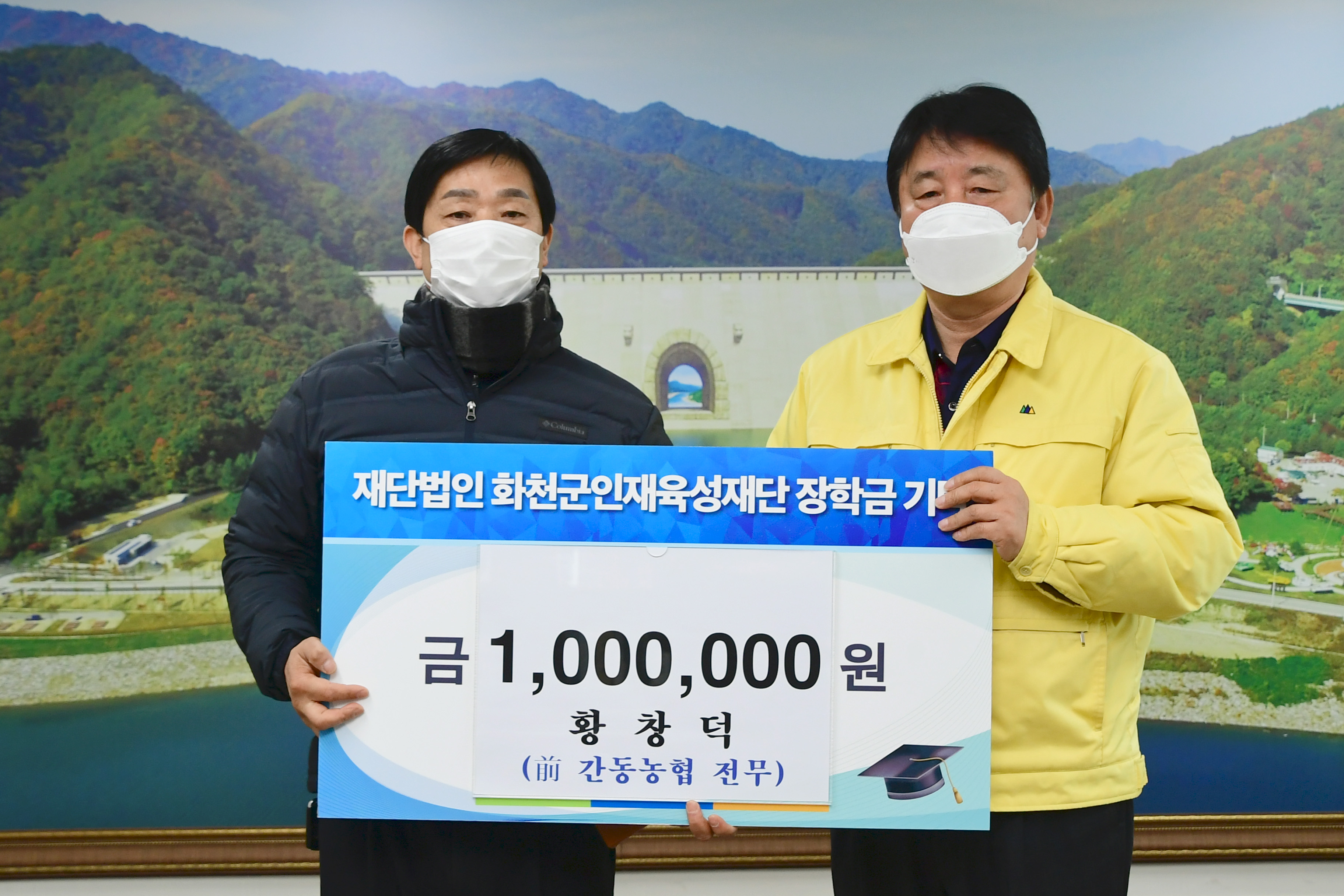 [강원사회복지신문 서은진 기자]=황창덕 전 간동농협 전무는 지난 2월 8일 최문순 화천군 인재육성재단 이사장을 방문해 장학금 100만원을 기탁했다.