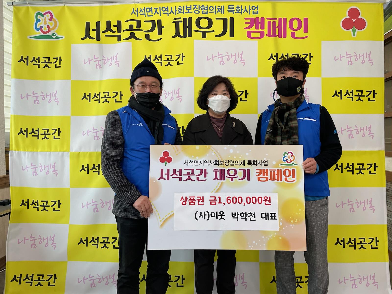 [강원사회복지신문 홍기한 기자]=(사)이웃(대표 박학천)은 지난 2월 7일 홍천군 서석면 행정복지센터를 방문, 지역의 어려운 이웃에게 전달해 달라며 홍천사랑상품권 160만원을 전달했다. 김정란 서석면장은 "복지소외계층을 위한 이웃사랑을 실천해주신 (사)이웃 박학천 대표님께 감사드린다”며 “후원금은 서석곳간을 통해...