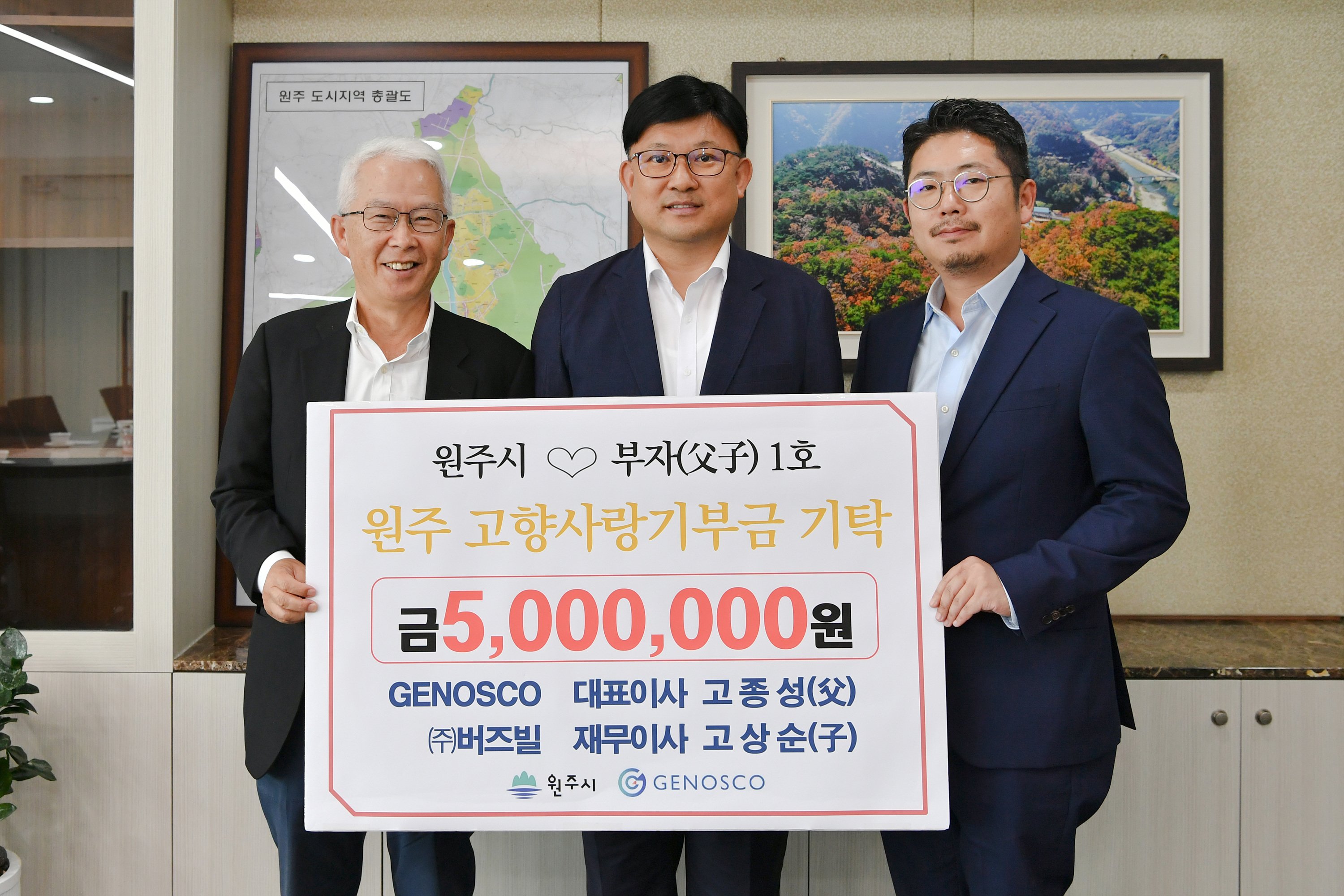 [강원사회복지신문 최재석 기자]=GENOSCO 대표이사 고종성(父), (주)버즈빌 재무이사 고상순(子) 원주시 고향사랑기부제가 올해 1월부터 본격적으로 시행된 가운데, 원주 발전을 위해 부자(父子)가 함께 기부행렬에 동참해 눈길을 끌고 있다. 그 주인공은 GENOSCO 고종성 대표이사와 아들인 (주)버즈빌 고상순 재무이사다. G...