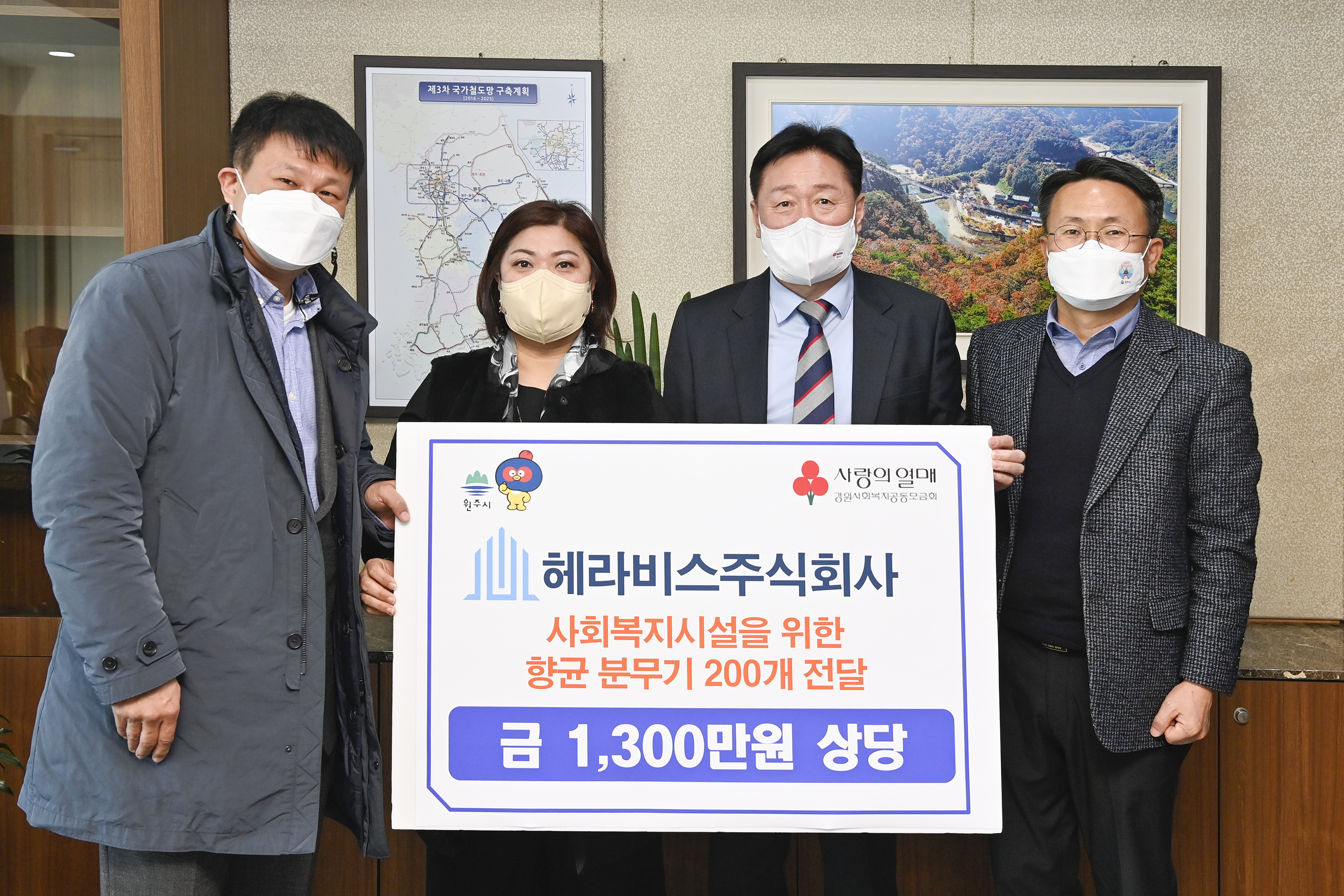 [강원사회복지신문 이정환 기자]=헤라비스주식회사(대표 이성진)는 지난 1월 26일 오후 2시 원주시청 부시장 집무실을 방문해 1,300만 원 상당 항균 분무기 200개를 전달했다. 헤라비스주식회사는 2016년 원주시에 설립되어 건축자재 도소매 등을 경영하고 2021년 옥시타이탄이라는 광촉매 제품으로 항균 코팅제를 개발했다....