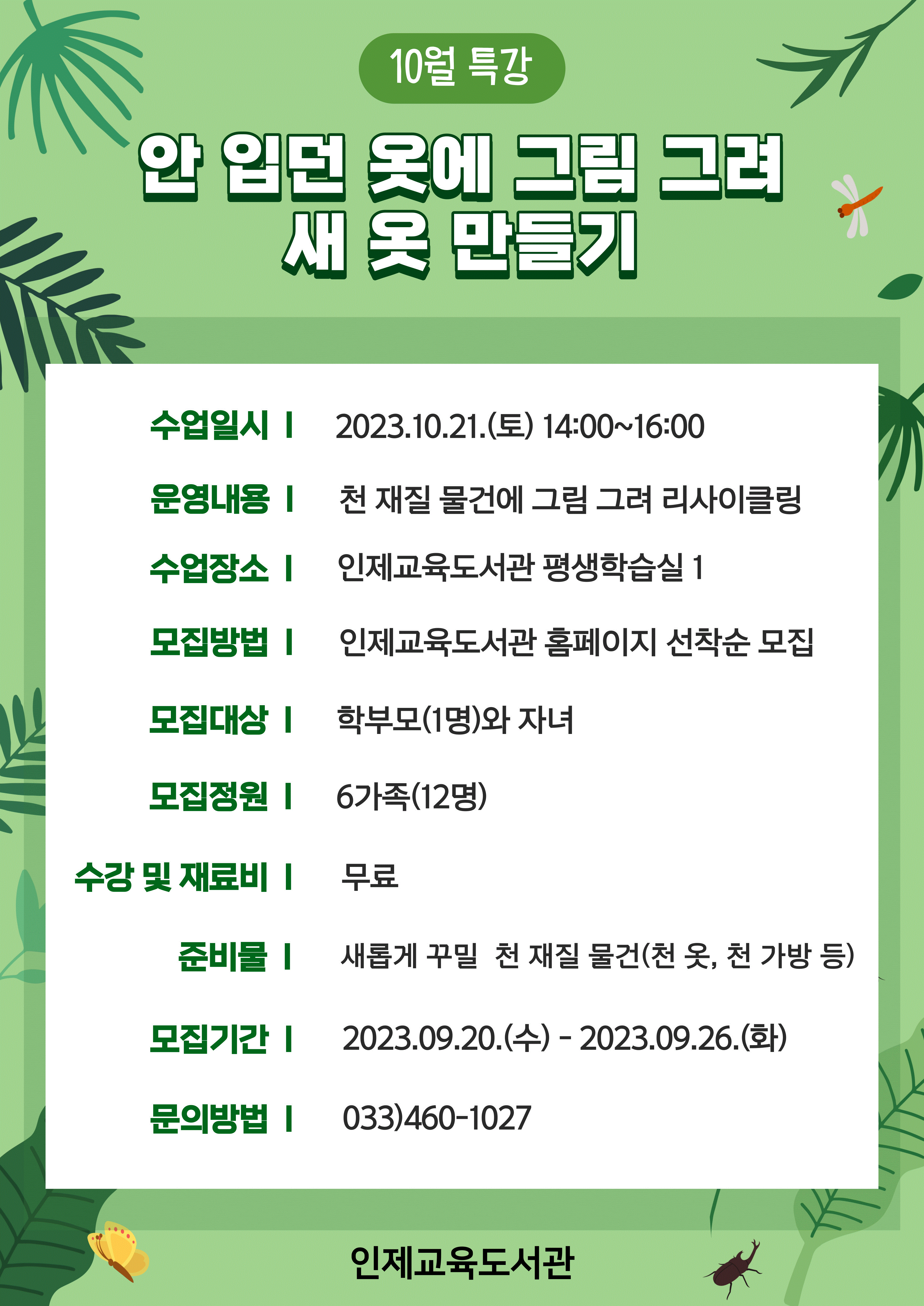 [강원사회복지신문 서은진 기자]=인제교육도서관(관장 최복진)은 오는 10월 21일(토) 가족과 함께하는 특강을 운영한다. 10월 가족과 함께하는 월별 특강에서는 지역 내 가족(학생 1명당 가족 1명)을 대상으로 '안 입던 옷에 그림 그려 새 옷 만들기' 프로그램을 진행한다. 오는 9월 20일(수)부터 9월 26일(화)까지 인제교육...