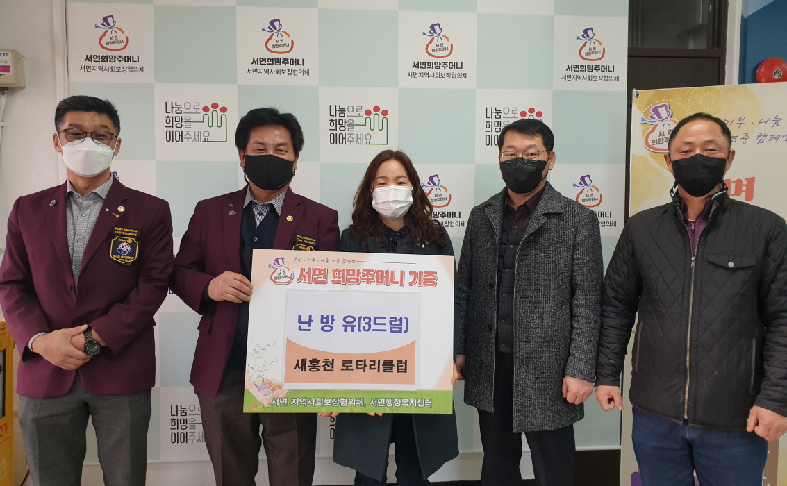 [강원사회복지신문 유경수 기자]=새홍천로타리클럽(회장 김상섭)은 지난 1월 17일 홍천군 서면 행정복지센터를 방문, 사랑의 난방유 3드럼(600L)을 전달했다. 전달된 난방유는 동절기 난방비로 어려움을 겪고 있는 저소득층에게 전달될 예정이다.