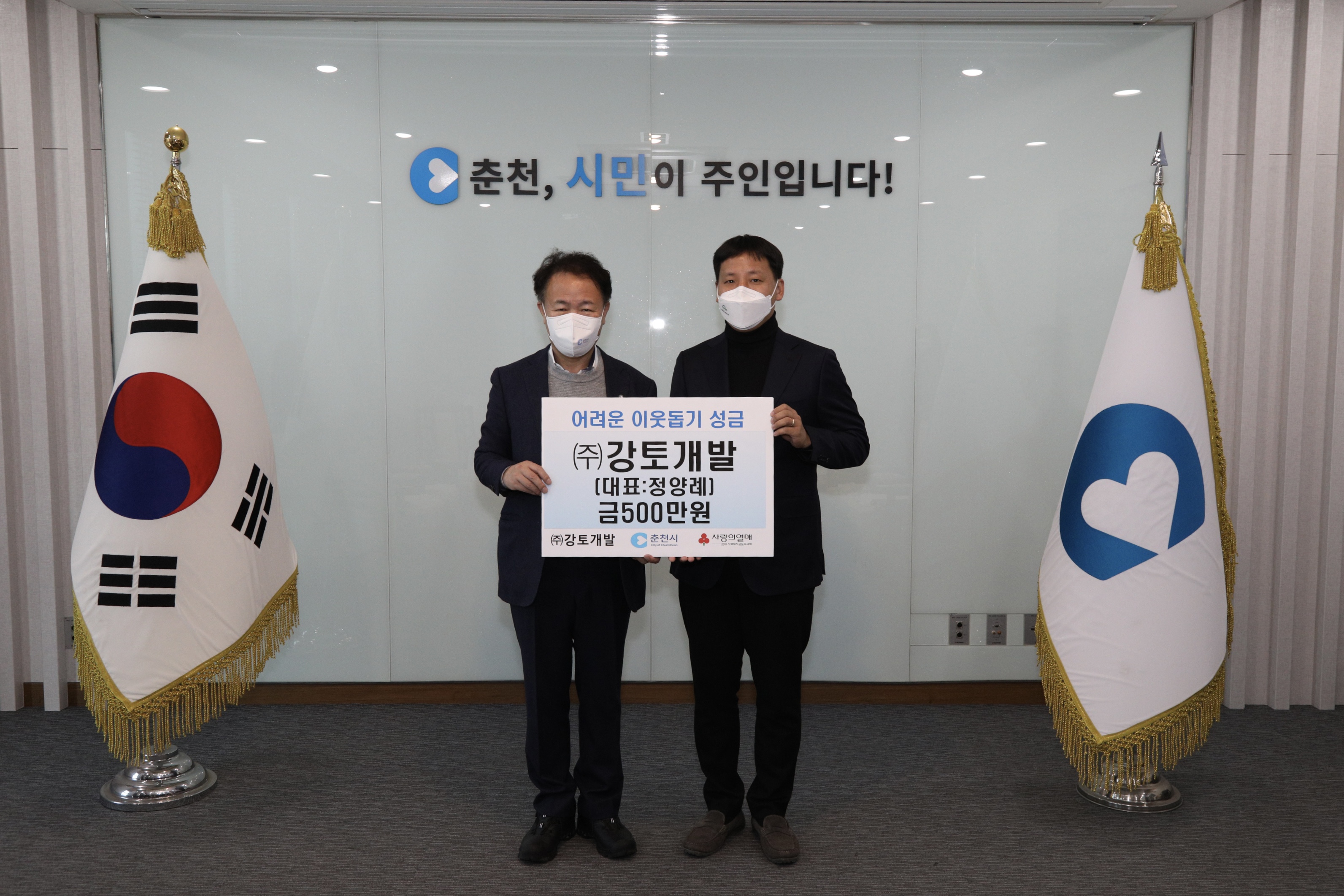 [강원사회복지신문 서은진 기자]=(주)강토개발(대표:정양례)은 지난 1월 13일 어려운 이웃을 돕기 위해 500만원의 후원금을 춘천시정부에 기탁했다.