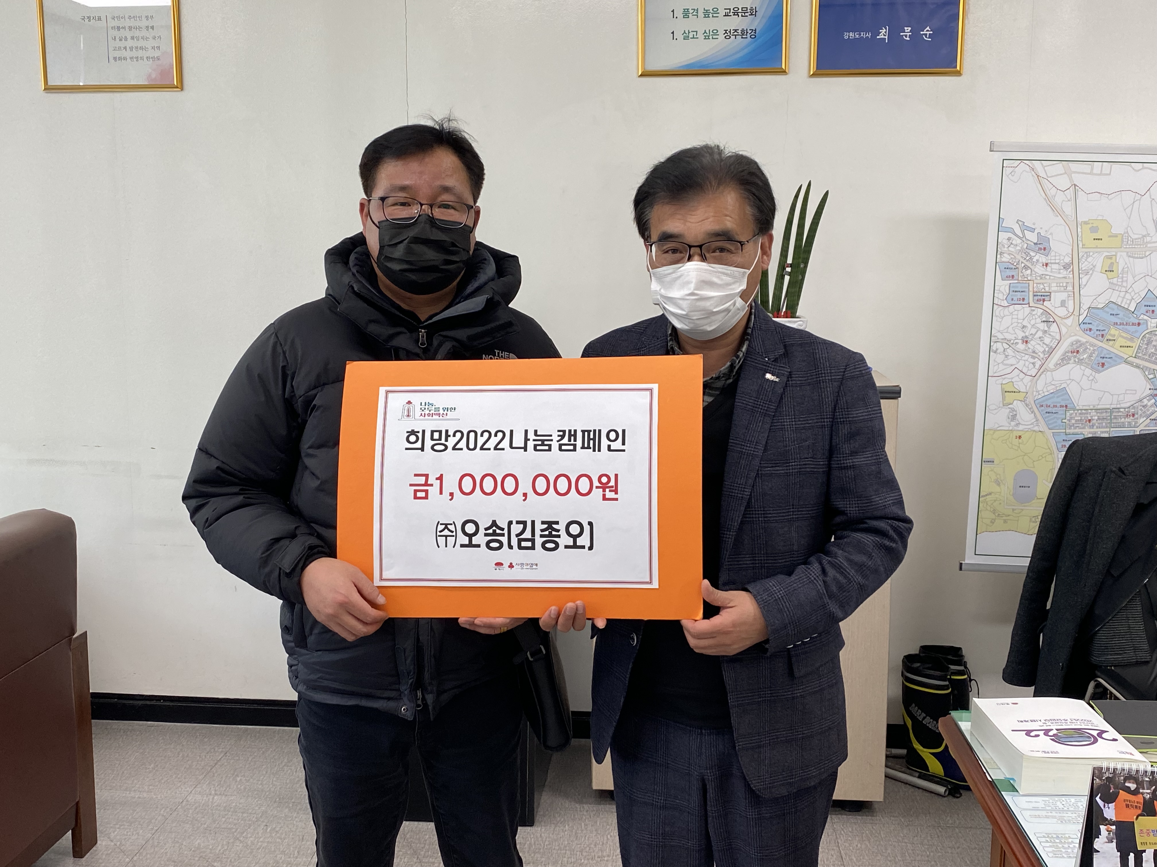 [강원사회복지신문 홍기한 기자]=동해시 소재 (주)오송(대표 김종오)에서 동해시 천곡동 행정복지센터를 방문해 코로나19로 어려움을 겪고 있는 저소득층이 따뜻한 신년을 보낼 수 있도록 현금 일백만원을 희망2022나눔캠페인 성금으로 지정 기탁했다.