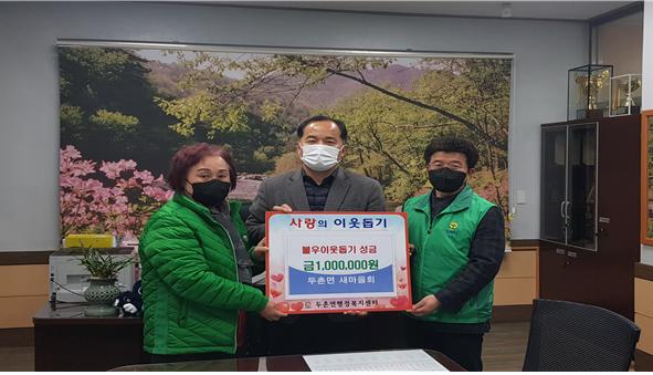 [강원사회복지신문 홍기한 기자]=홍천군 두촌면 새마을협의회(회장 장창기, 부녀회장 박귀덕)는 지난 12월 29일 두촌면 행정복지센터를 방문, 어려운 이웃돕기 성금 100만원을 전달했다. 전달된 성금은 관내 저소득층의 따뜻한 겨울나기를 위해 사용될 예정이다. 이성희 두촌면장은 "후원금을 기탁해주신 두촌면 새마을협의회...