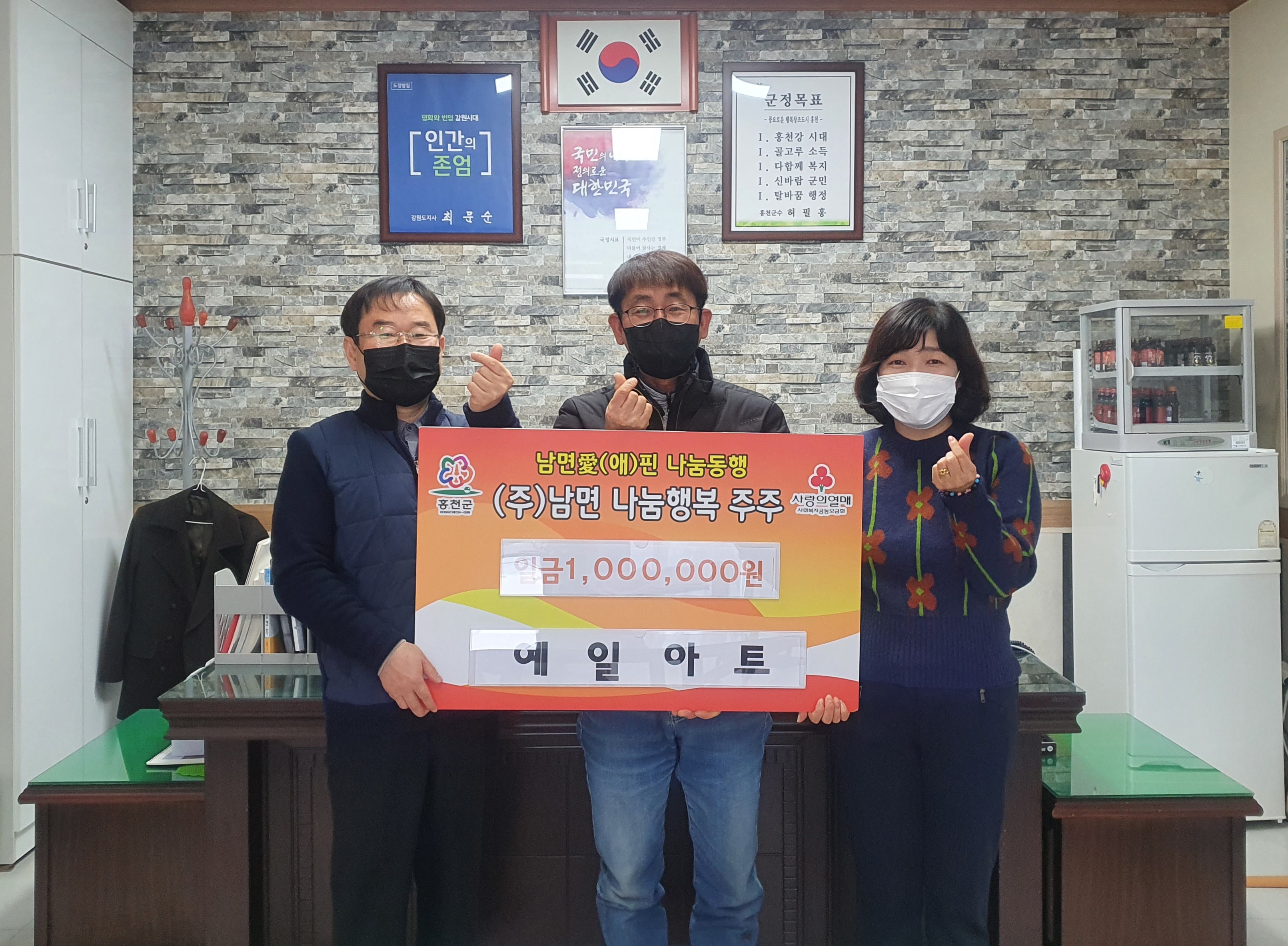 [강원사회복지신문 홍기한 기자]=예일아트(대표 이운정)는 지난 12월 29일 홍천군 남면행정복지센터를 방문해 '어려운 이웃 돕기 성금' 100만원을 기탁했다. 이운정 대표는 "광고업을 하면서 해마다 수익금의 일부를 저축하여 연말에 이웃돕기 성금으로 기탁하고 있다. 그때마다 좋은 일에 동참할 수 있어 행복함을 느낀다"고...