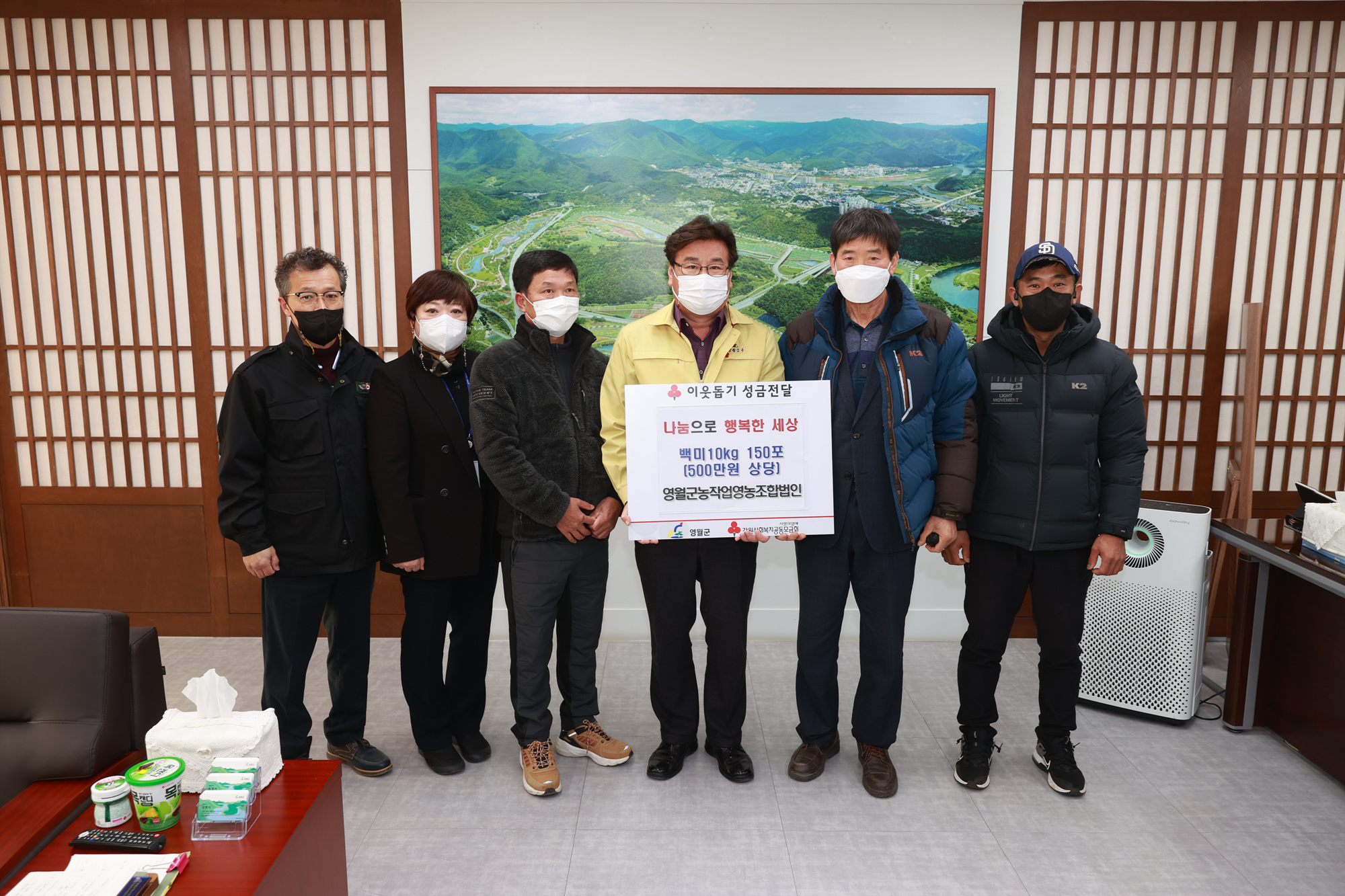 [강원사회복지신문 서은진 기자]=영월군농작업영농조합법인(대표 이명수)에서는 지난 12월 27일 백미10kg 150포(500만원 상당)를 영월군에 기탁했다. 기탁자는 "동절기 어려운 이웃에게 보탬이 되길 바란다면서 앞으로도 관내 어려운 이웃들을 위해 다양한 노력을 기울이겠다."라고 말했다. 기탁물품은 기탁자의 뜻에 따라 관...