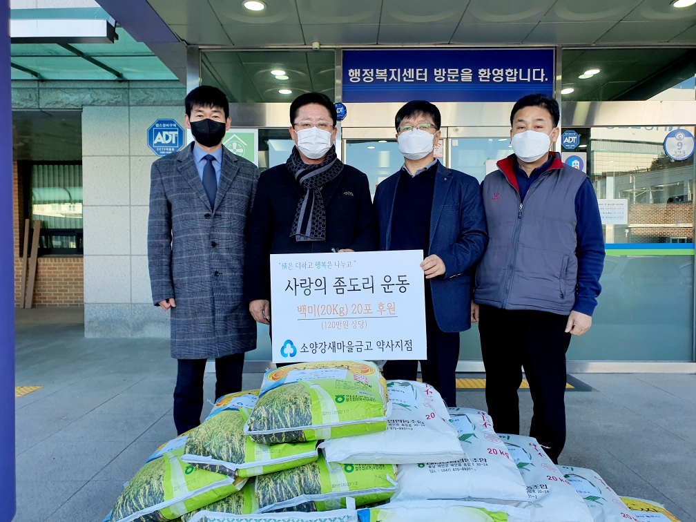 [강원사회복지신문 유경수 기자]=MG소양강새마을금고(이사장:신영길)는 지난 12월 27일 오전 10시 춘천시 약사명동행정복지센터에 약사명동 관내 취약계층을 위한 사랑의 좀도리 운동 일환으로 백미(20kg) 20포를 전달했다.