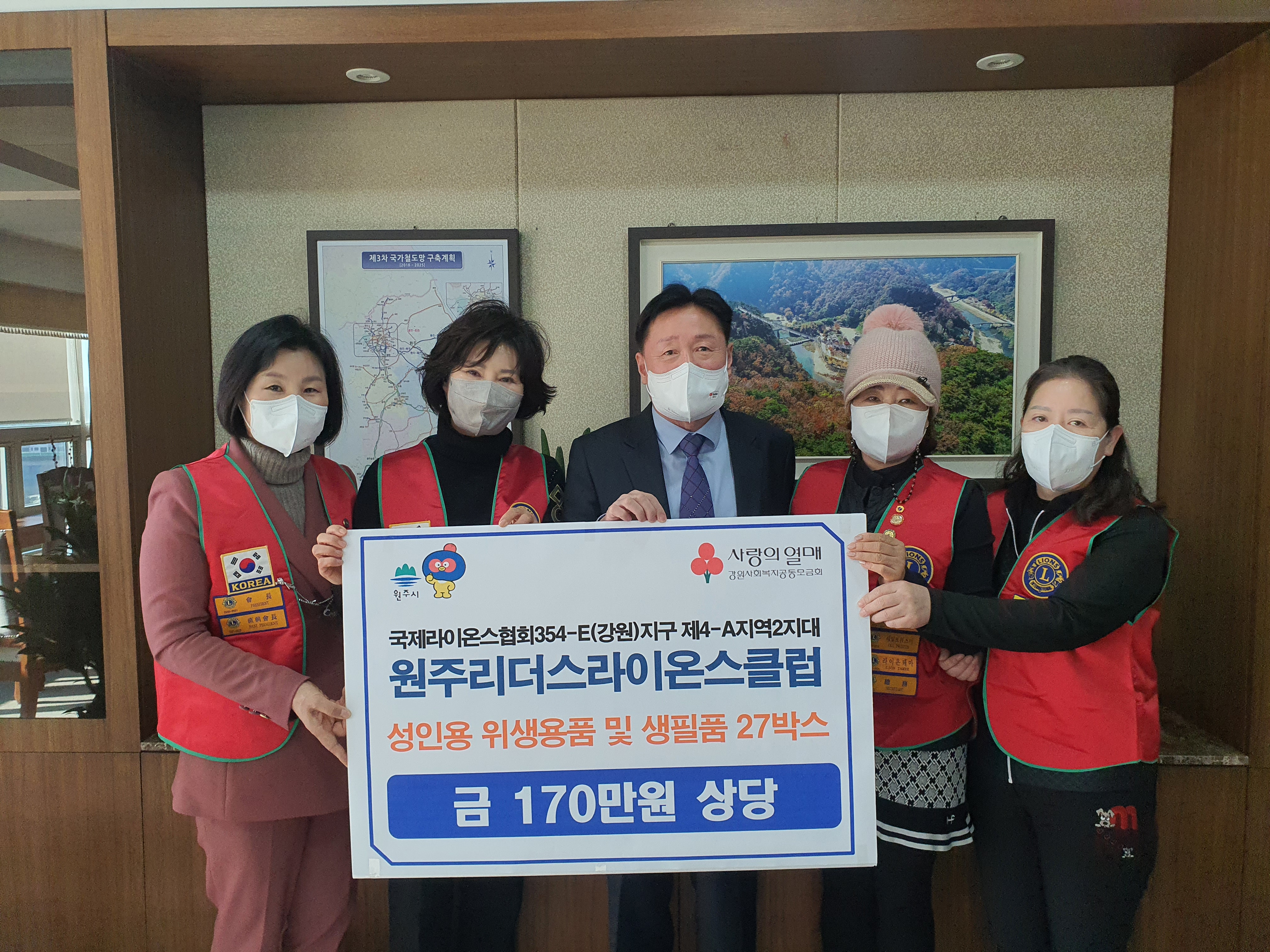 [강원사회복지신문 서은진 기자]=원주리더스라이온스클럽(회장 김옥순)은 지난 12월 27일 원주시청 부시장 집무실을 방문해 170만 원 상당의 성인용 위생용품 및 생필품 27박스를 전달했다. 후원품은 사회복지공동모금회를 통해 관내 복지시설에 전해질 예정이다. 2017년 3월 창립된 원주리더스라이온스클럽은 독거노인 생필...