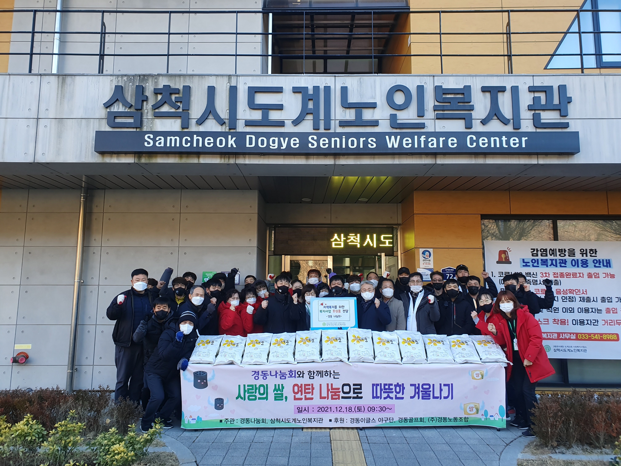 [강원사회복지신문 김종한 기자]=삼척시 도계 경동나눔회에서는 지난 12월 18일 경동이글스 야구단과 경동골프회, ㈜경동노동조합의 후원으로 지역의 취약어르신들에게 연탄 8,000장, 쌀10kg 180포, 100만원 상당의 과자 등 따뜻한 겨울나기 후원품을 삼척시도계노인복지관에 전달했다. 경동노동조합 김용대 노조위원장은 "정...