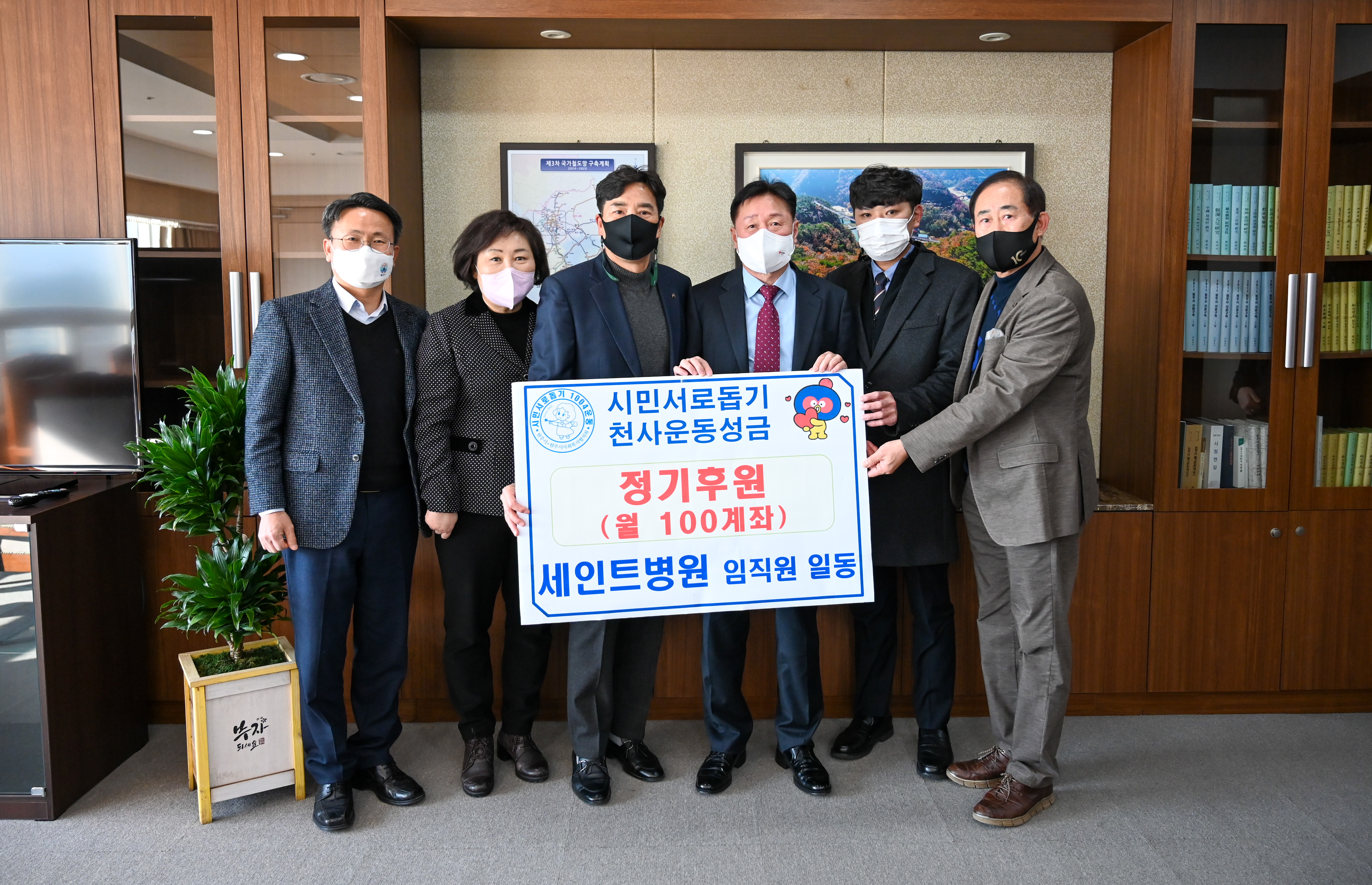 [강원사회복지신문 서은진 기자]=원주세인트병원(이사장 박상기)은 시민서로돕기 천사운동에 임직원 1인 1계좌(1,004원), 총 100계좌(월 100,400원)를 정기후원하기로 하고 지난 12월 22일 원주시청 부시장 집무실에서 전달식을 가졌다. 박상기 이사장은 "작은 나눔이지만 한 사람의 열 걸음보다 열 사람의 한 걸음이 더 큰 ...