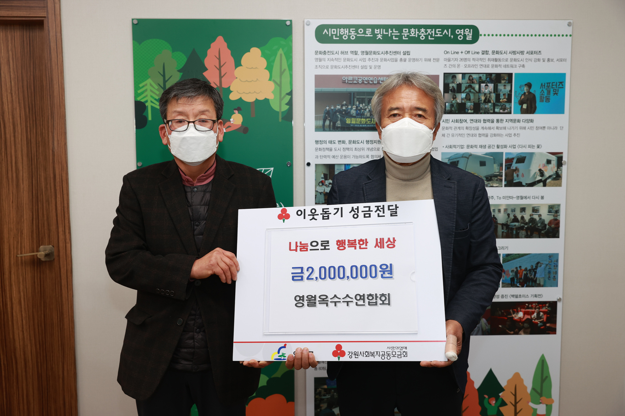 [강원사회복지신문 홍기한 기자]=영월군옥수수연합회(대표 이용우)에서는 지난 12월 20일 영월군에 현금 200만원을 기탁했다. 기탁자는 "코로나19와 추운 겨울로 이웃의 관심과 사랑이 필요한 연말을 맞아 나눔의 정을 나누고자 기탁에 참여하게 되었다."고 전했다. 기탁된 성금은 기탁자의 뜻에 따라 관내 취약계층에게 전달...