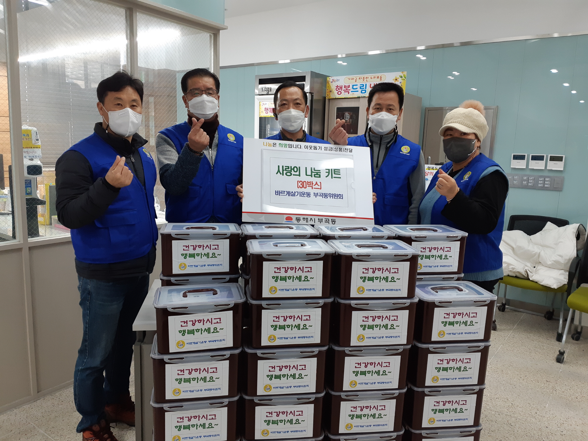 [강원사회복지신문 서은진 기자]=바르게살기운동 부곡동위원회(위원장 최정용)는 지난 12월 26일 어려운 이웃을 위한 사랑의 나눔 키트 30박스를 동해시 부곡동행정복지센터에 기탁했다. 사랑의 나눔 키트는 회원들이 정성을 모아 마스크, 손소독 티슈, 햇반, 김 등 방역물품과 즉석식품 10종으로 구성돼, 동해시 부곡동 관내...