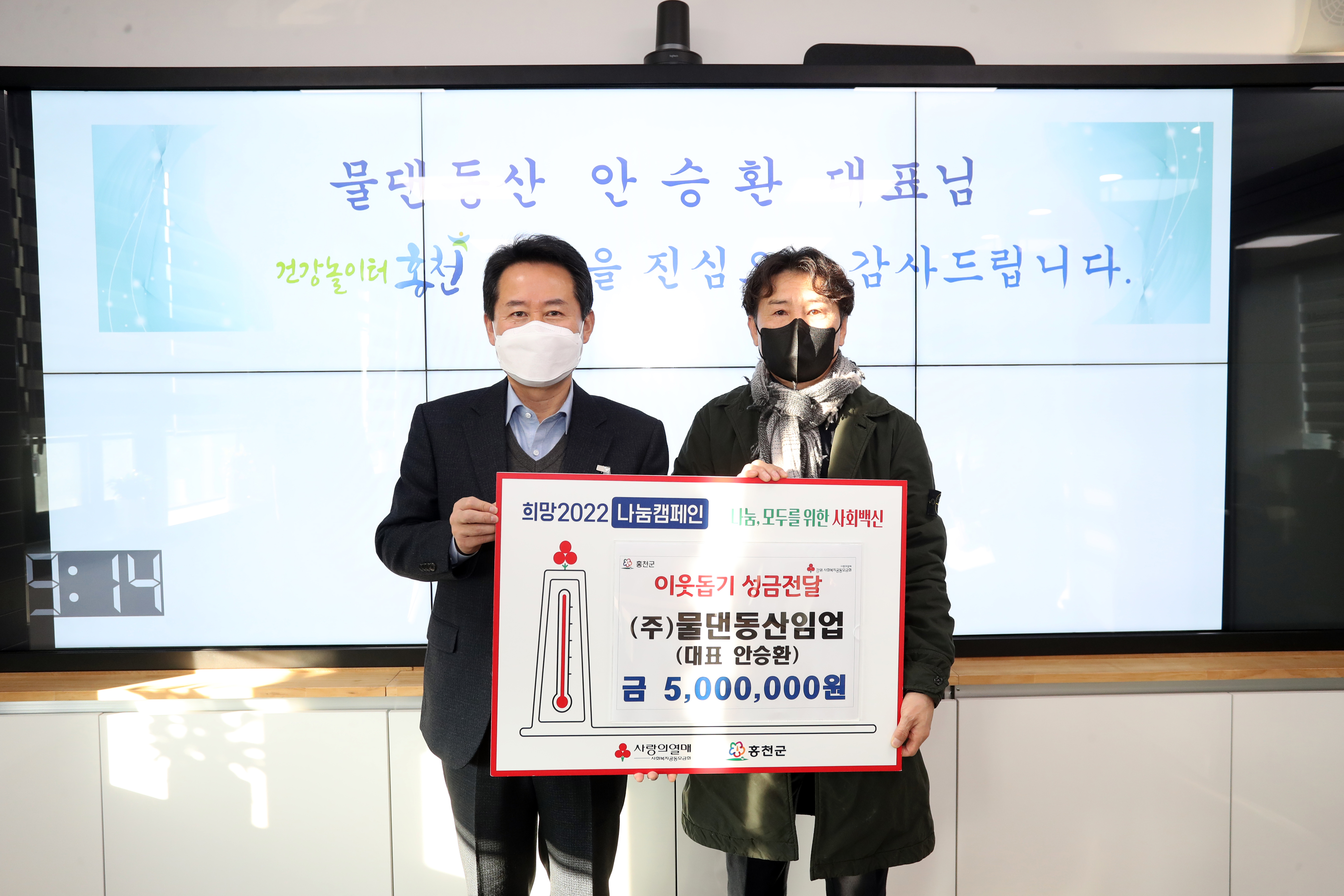 [강원사회복지신문 홍기한 기자]=(주)물댄동산임업(대표 안승환)은 지난 12월 22일 홍천군청을 방문, 어려운 이웃돕기 성금 500만원을 기탁했다. 안승환 대표는 "지난해에 이어 올해도 홍천 지역 내 어려운 이웃들에게 희망을 전달하고자 성금을 기탁하게 됐다"고 말했다.
