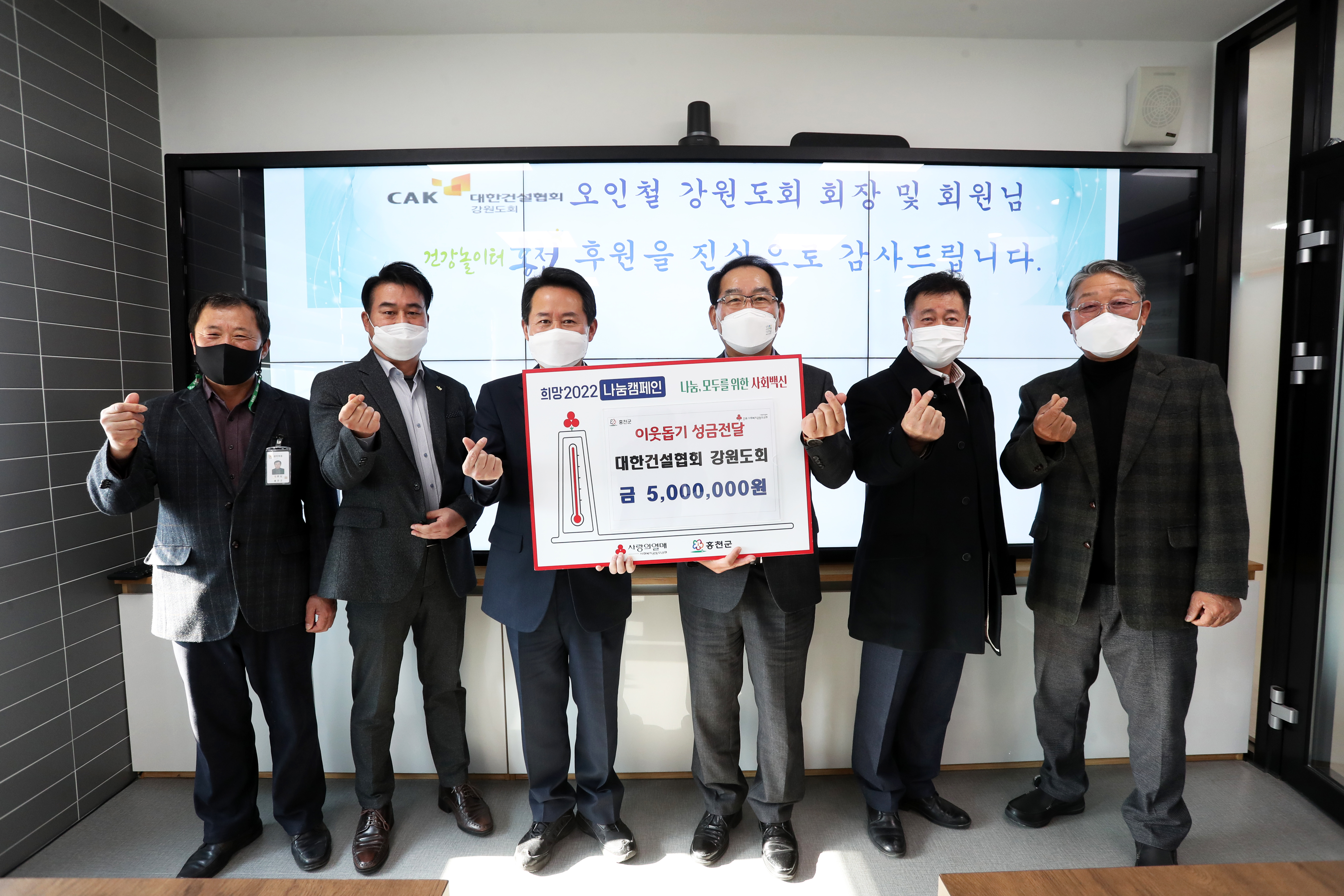 [강원사회복지신문 홍기한 기자]=대한건설협회 강원도회는 연말을 맞아 어려운 이웃을 위해 사용해 달라며 이웃돕기 성금 500만원을 지난 12월 20일 홍천군청에 기탁했다. 이날 기탁 받은 후원금은 강원도 사회복지공동모금회를 통해 홍천군 지역 내 어렵게 생활하고 있는 이웃들을 위해 사용될 예정이다.