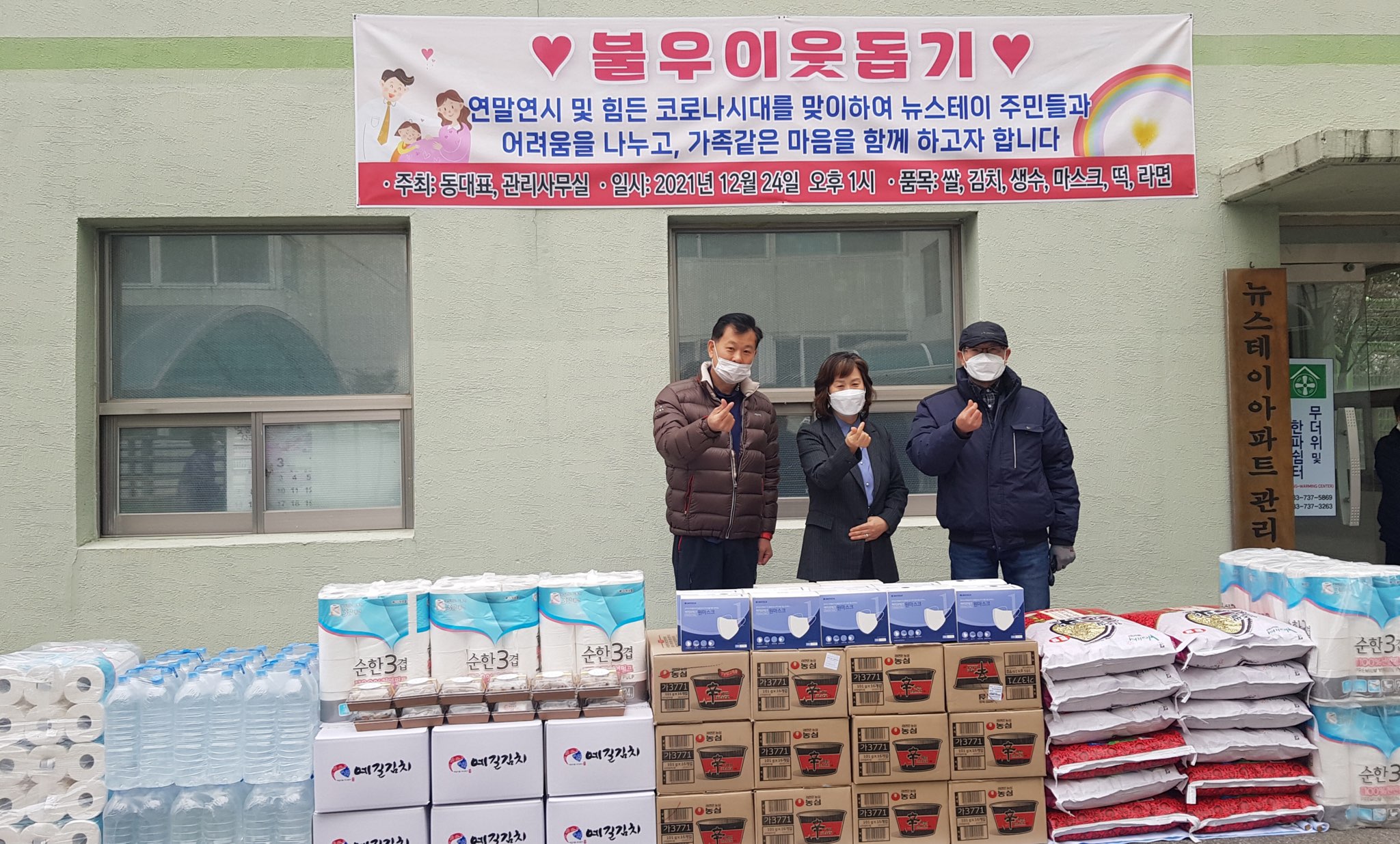 [강원사회복지신문 유경수 기자]=원주시 태장2동 뉴스테이아파트 심기섭·정태진·안태종 동대표 일동과 최동일 관리소장은 지난해 12월 24일 쌀(20㎏), 김치, 라면, 생수, 떡, 휴지, 마스크 등 취약계층을 위한 188만 원 상당의 후원물품을 태장2동 행정복지센터(동장 정은일)에 전달했다.