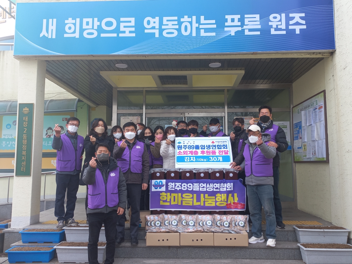 [강원사회복지신문 서은진 기자]=1989년 원주지역 고등학교 졸업생 모임인 원주89졸업생연합회(회장 한재희)는 지난 12월 12일 관내 소외계층을 위한 한마음 나눔 행사를 열고 김치(10kg) 30박스와 사골곰탕 120 봉지를 원주시 태장2동 행정복지센터(동장 정은일)에 전달했다.