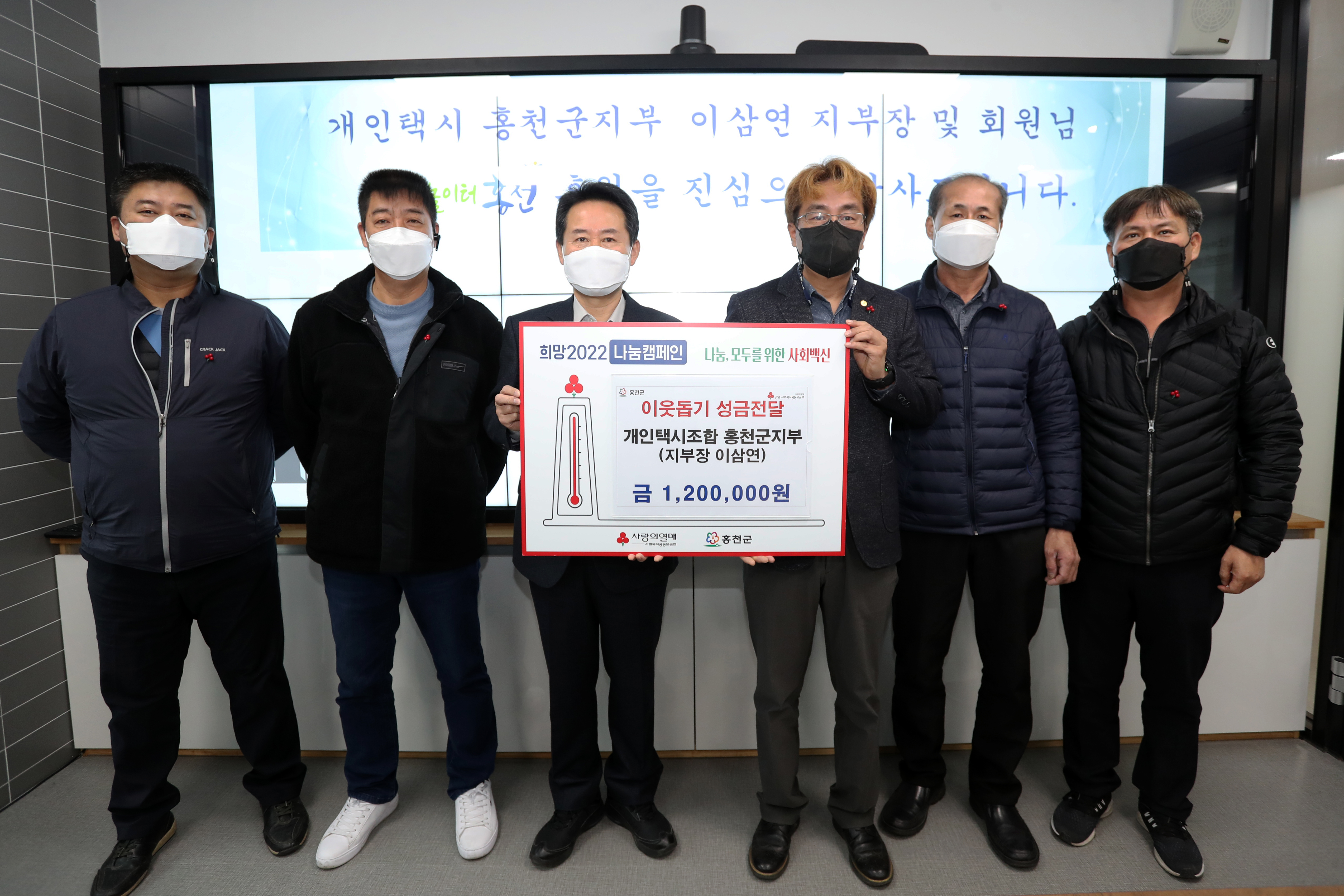 [강원사회복지신문 홍기한 기자]=개인택시운송사업조합 홍천군지부(지부장 이삼연)는 지난 12월 15일 홍천군청을 방문, 어려운 이웃돕기 성금 120만원을 기탁했다. 개인택시 홍천군지부는 매년 조합원 전원이 십시일반으로 성금을 모아 관내 취약계층을 위한 성금을 기탁하고 있다. 이삼연 지부장은 "코로나19로 경기가 어려...