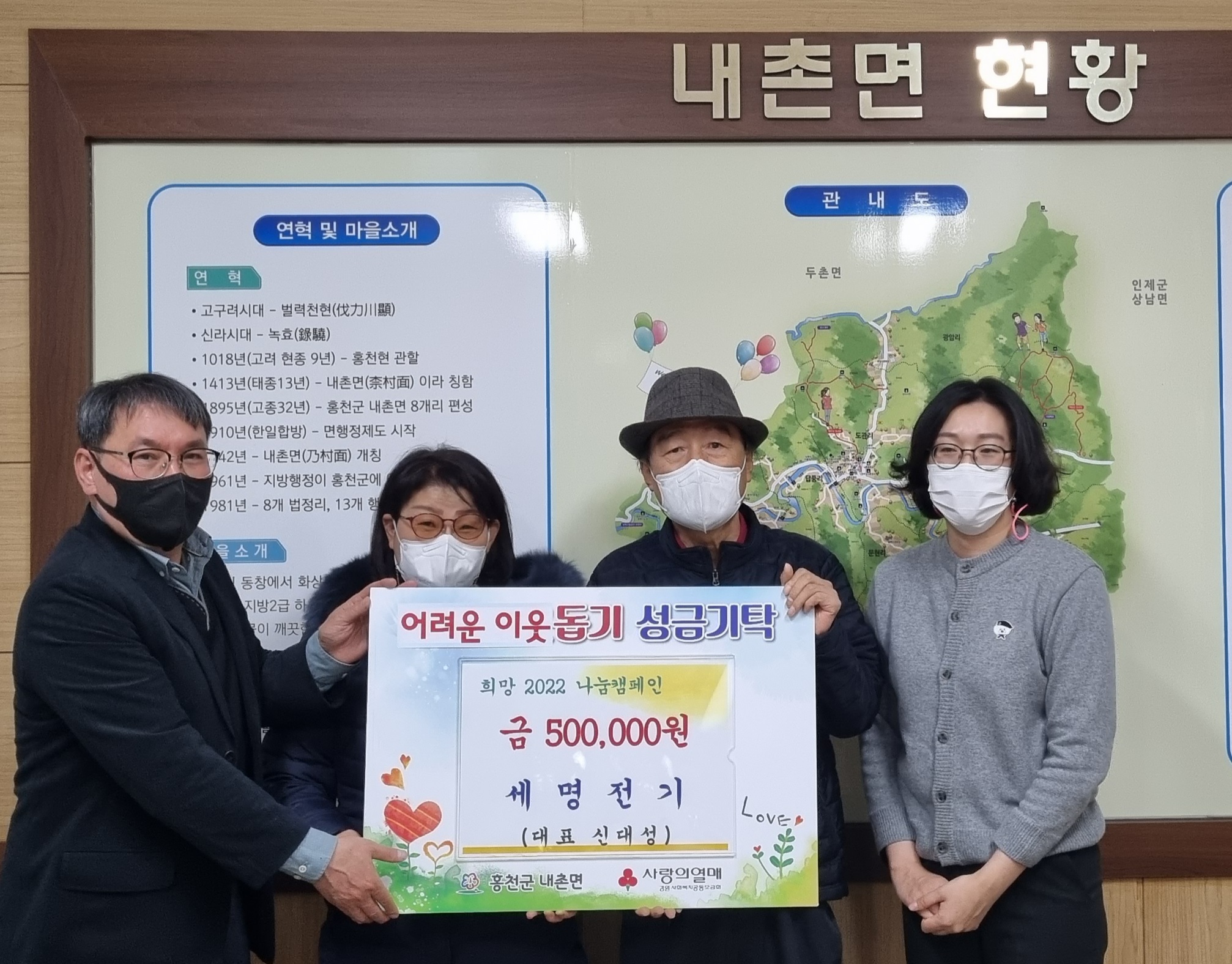 [강원사회복지신문 홍기한 기자]=세명전기(대표 신대성)는 지난 12월 13일 홍천군 내촌면 행정복지센터를 방문, 어려운 이웃돕기 성금 50만원을 기탁했다. 신대성 대표는 "지역에서 사업을 운영하고 있어 수익의 일부를 지역의 어려운 이웃들에게 환원하고 싶다"며 "내촌면의 취약계층 이웃들이 올 겨울 이웃의 온정을 느낄 ...