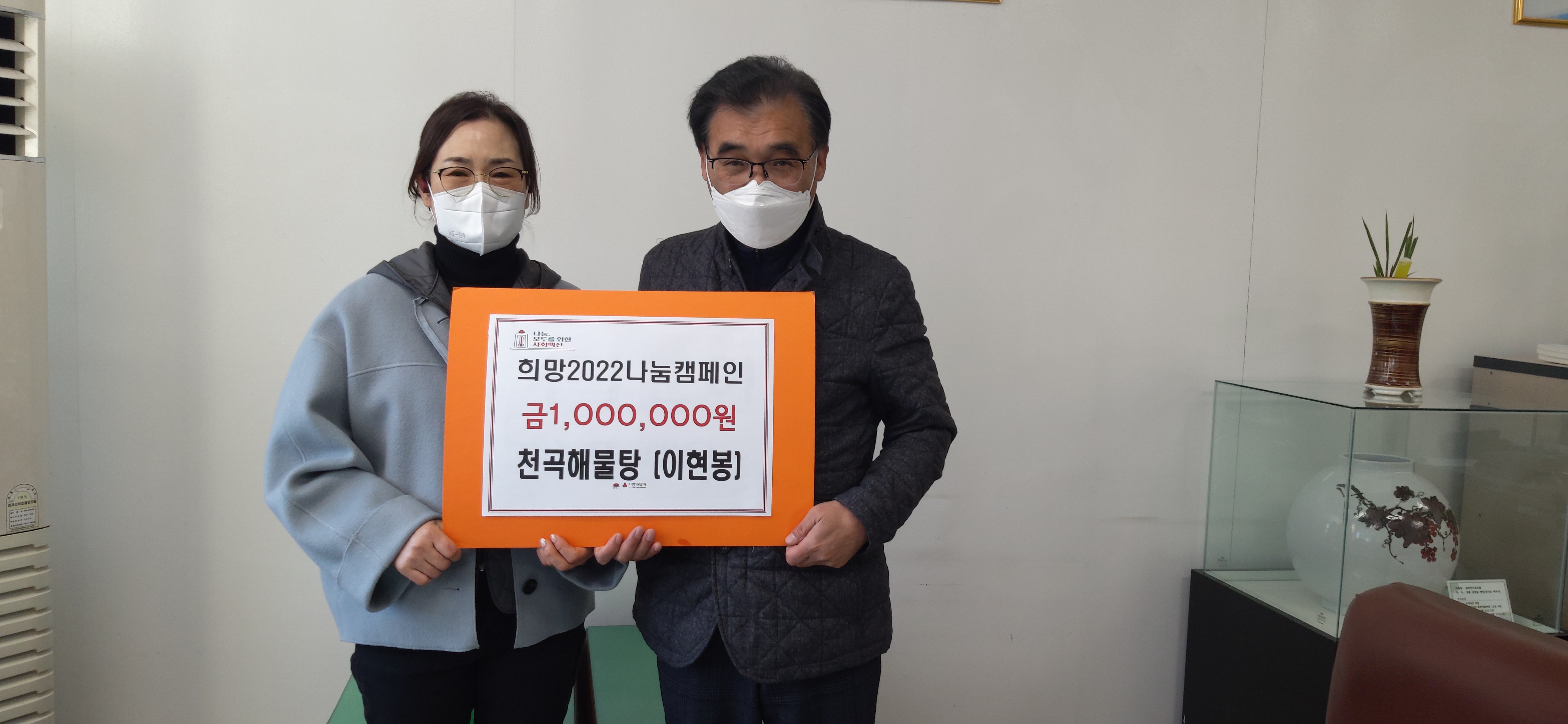 [강원사회복지신문 김종한 기자]=동해시 천곡동 소재 천곡해물탕(대표 이현봉)에서 연말연시를 맞이해 주위 어려운 이웃에 대한 마음을 담아 희망2022 나눔캠페인 성금으로 현금 100만원을 기탁했다. 이현봉 대표는 어려움을 겪고 있는 이웃들의 따뜻한 겨울나기를 위해 매년 나눔캠페인에 동참하고 있으며, 올 5월에는 가정...