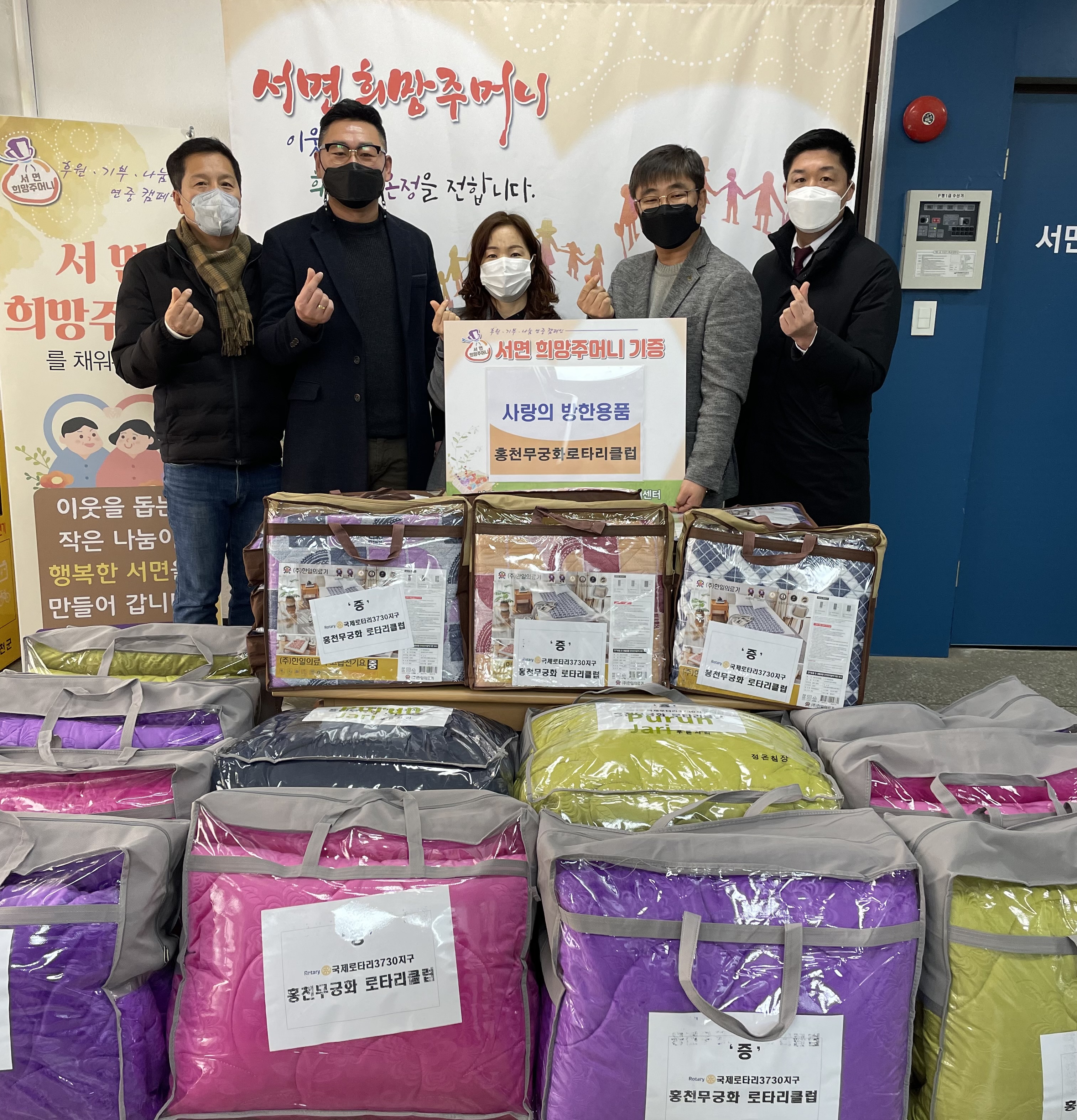 [강원사회복지신문 서은진 기자]=홍천 무궁화로타리클럽(회장 박장근)은 지난 12월 9일 홍천군 서면 행정복지센터를 방문, 사랑의 방한용품을 기탁했다. 기탁된 방한용품은 전기장판과 이불 세트로 관내 어려운 이웃 13가구에 전달될 예정이다. 홍천 무궁화로타리클럽은 매년 먹거리 지원, 에너지 취약계층 난방유 지원, 스포...
