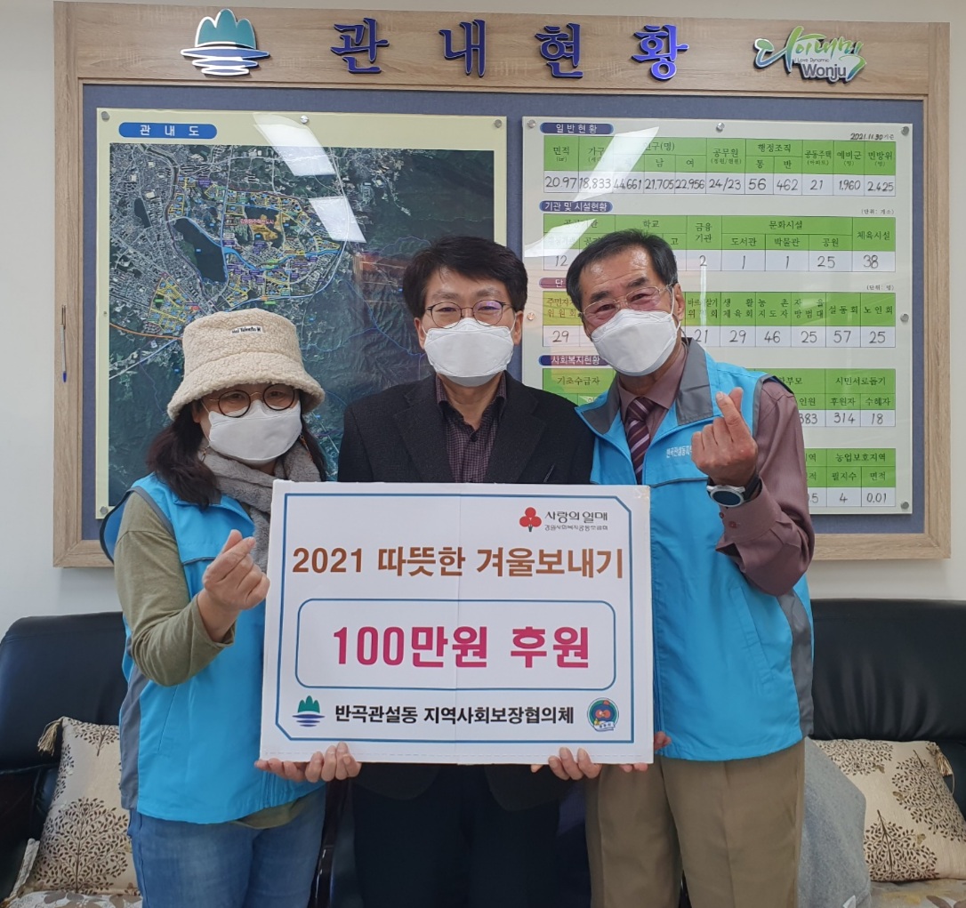 [강원사회복지신문 홍기한 기자]=원주시 반곡관설동 지역사회보장협의체(위원장 강동철)는 지난 12월 8일 취약계층을 위한 '2021 따뜻한 겨울 보내기 사랑의 후원금' 100만 원을 반곡관설동 행정복지센터(동장 김효중)에 전달했다.