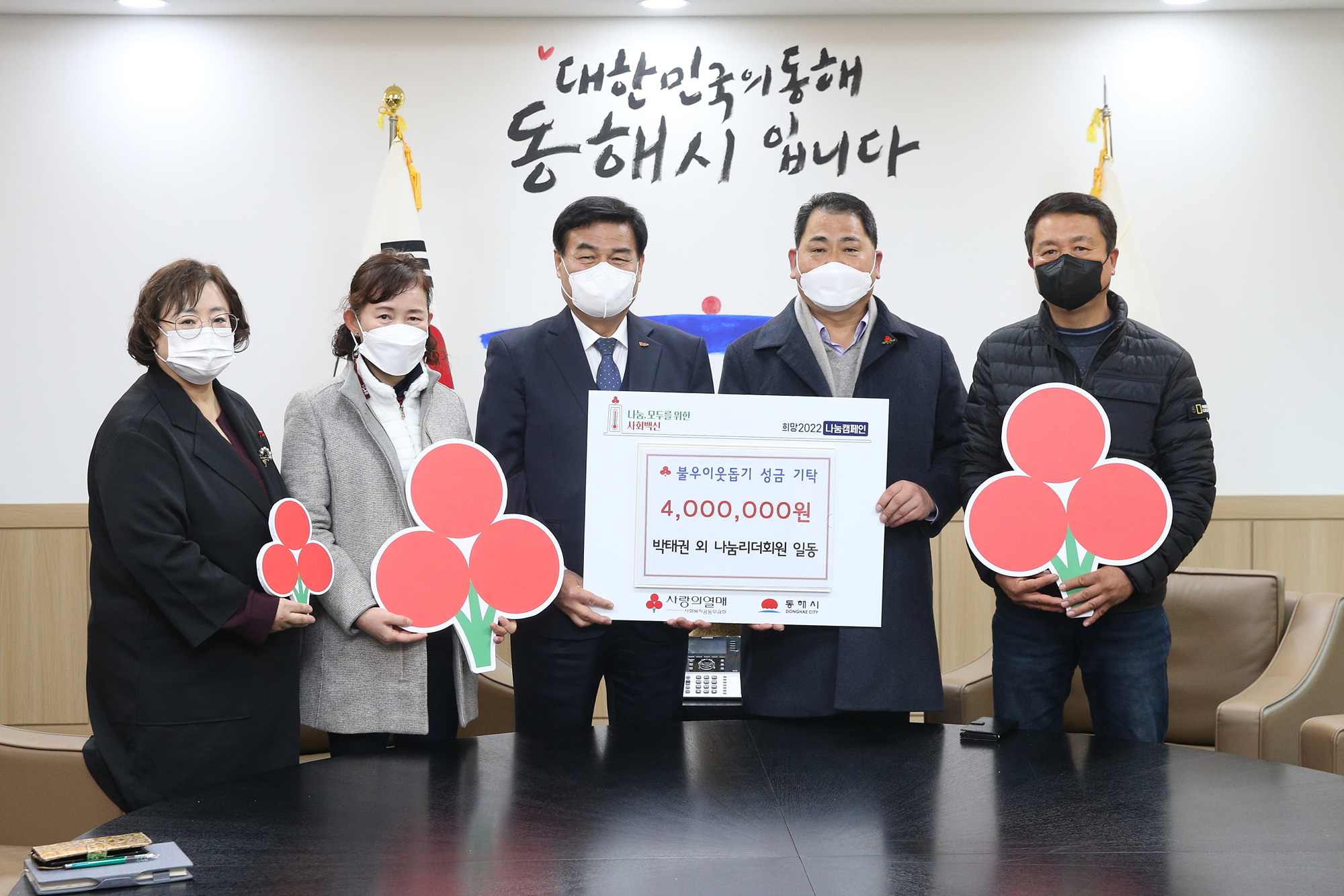 [강원사회복지신문 김종한 기자]=동해시 아너소사이어티 회원인 박태권 대표와 나눔리더 회원 일동이 지난 12월 8일 동해시청을 방문해 희망2022나눔캠페인 성금 4백만원을 기탁했다.