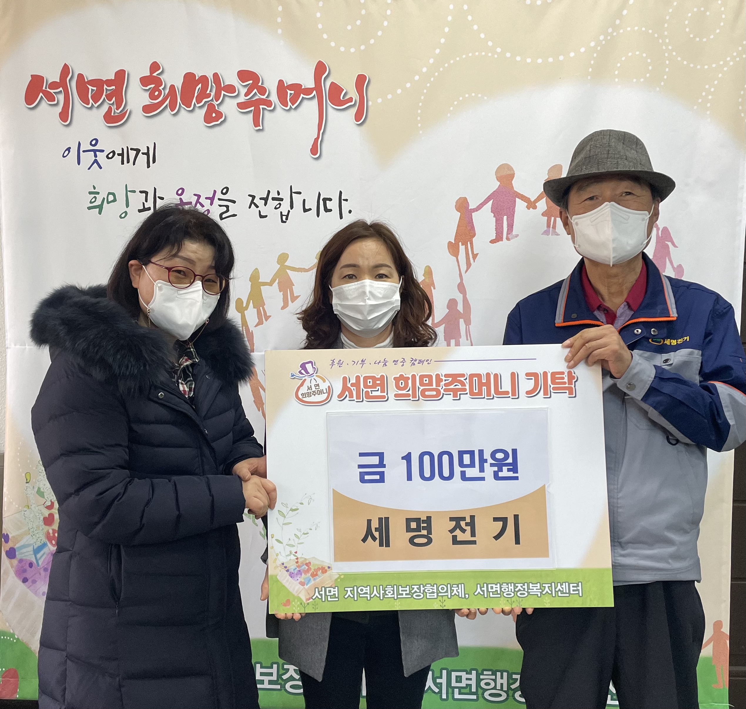 [강원사회복지신문 유경수 기자]=신대성 세명전기 대표는 지난 12월 8일 홍천군 서면 행정복지센터를 방문, 후원·나눔 문화 확산을 위해 시작된 '서면희망주머니'에 어려운 이웃돕기 성금 100만원을 기탁했다. 성금은 지역의 어려운 이웃을 위한 생계·자립지원, 집수리 등에 사용될 예정이다.