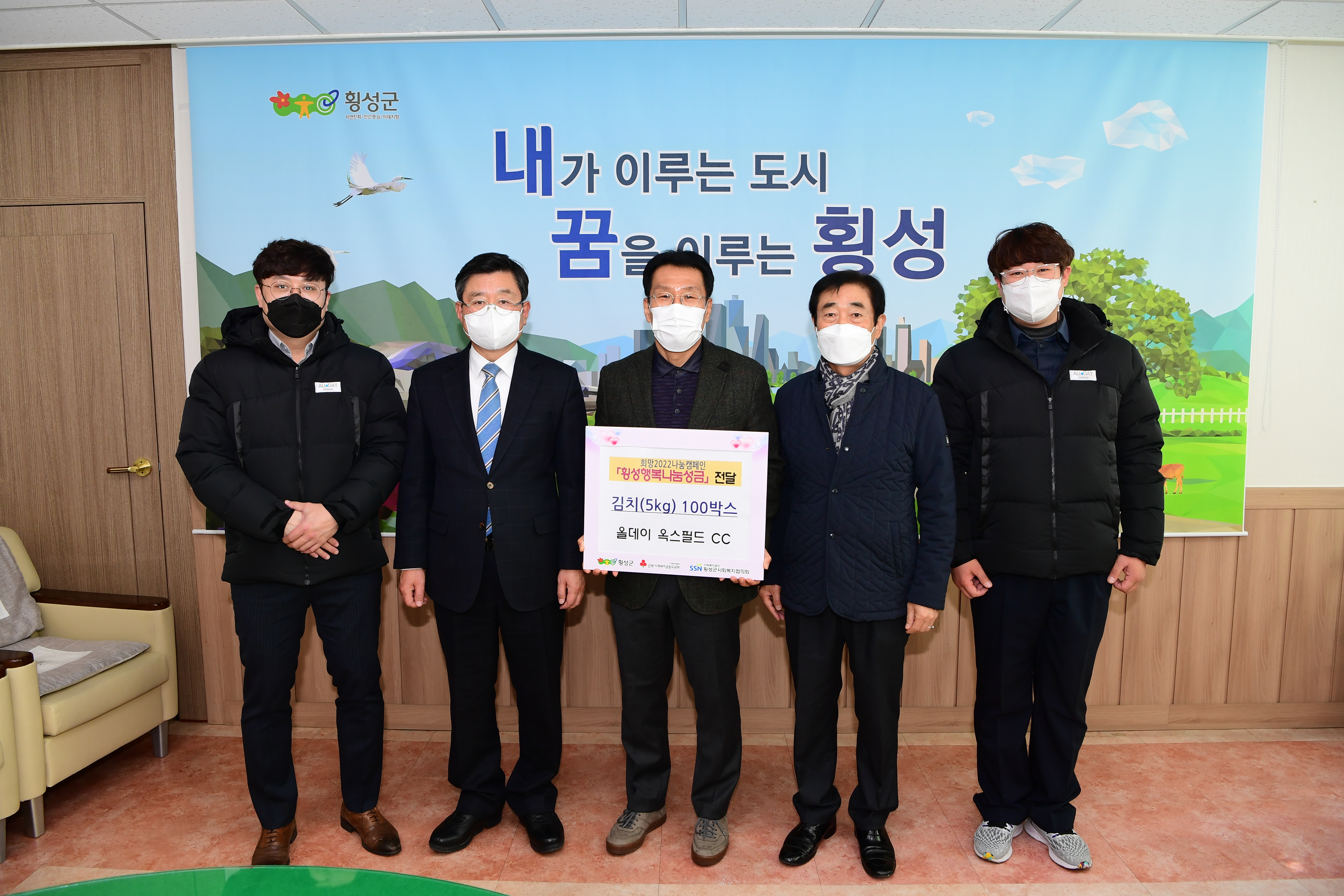 [강원사회복지신문 유경수 기자]=올데이 옥스필드CC(대표 최승협, 서원면 소재)는 지난 12월 8일 오전 11시 30분, 군수 집무실을 방문하여 김치(5kg) 100박스를 '횡성행복나눔성금'에 기탁했다. 이날 전달식에는 장신상 군수와 올데이 옥스필드CC 최승협 대표, 홍정표 부장, 노창래 팀장, 횡성군사회복지협의회 이석원 회장이...