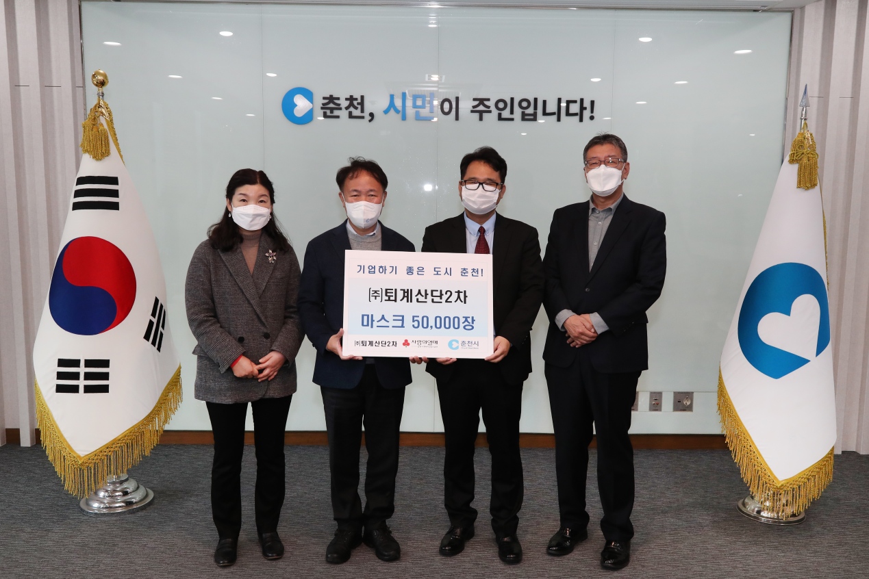 [강원사회복지신문 서은진 기자]=(주)퇴계산단2차(대표:윤동순)는 지난 11월 29일 오전 9시20분 춘천시청 3층 접견실에서 코로나19 극복을 위한 KF94 마스크 5만장을 기부했다.