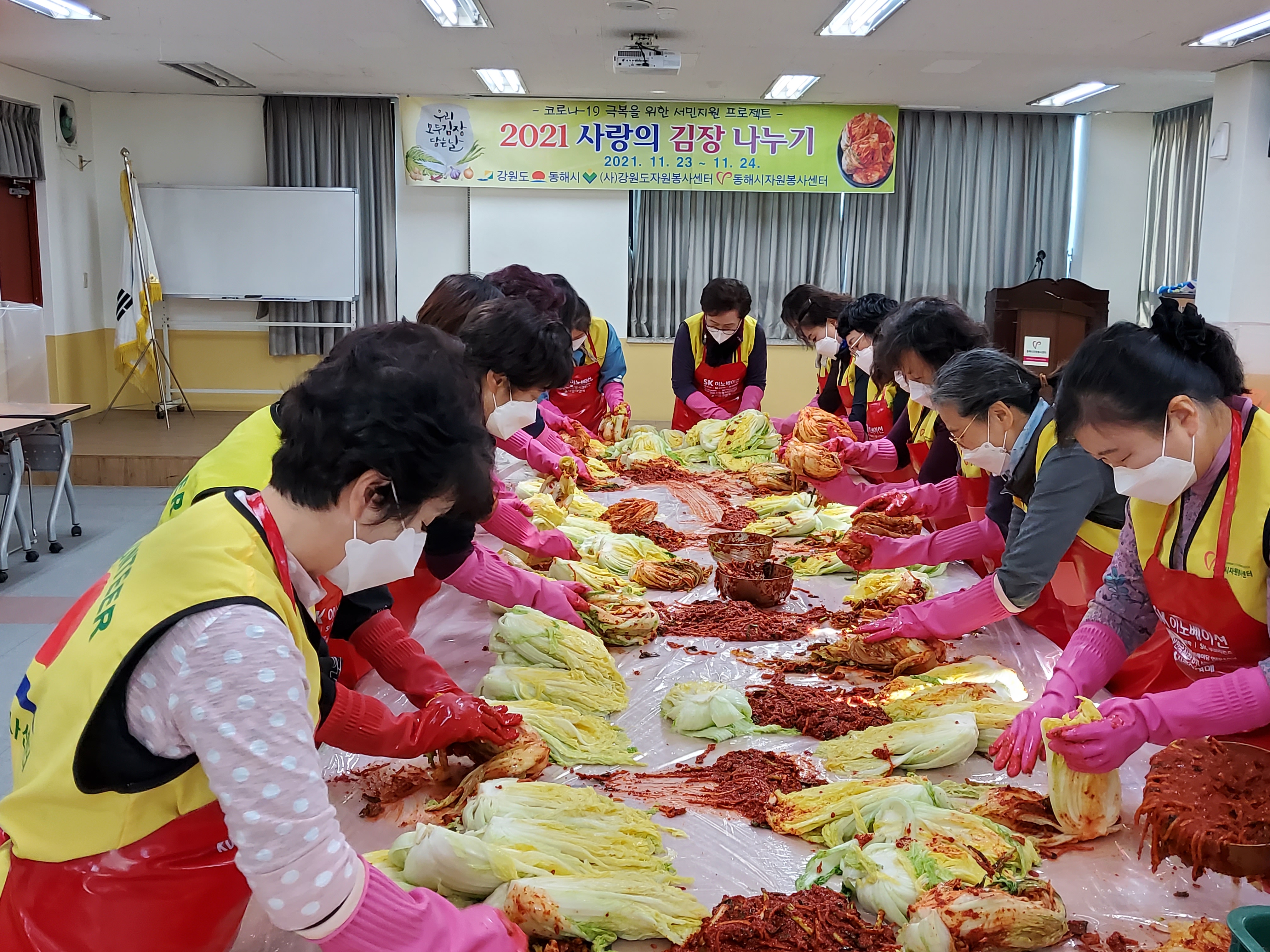 [강원사회복지신문 김종한 기자]=대한적십자봉사회동해지구협의회 회원 20여명 참석, 김장김치 10kg, 151박스 전달 동해시자원봉사센터(센터장 김대성)가 강원도와 동해시, (사)강원도자원봉사센터의 후원으로 지난 11월 23일과 24일 이틀간 동해시자원봉사센터에서 '2021 사랑의 김장나눔 행사'를 진행했다. 이번 행사는 사...