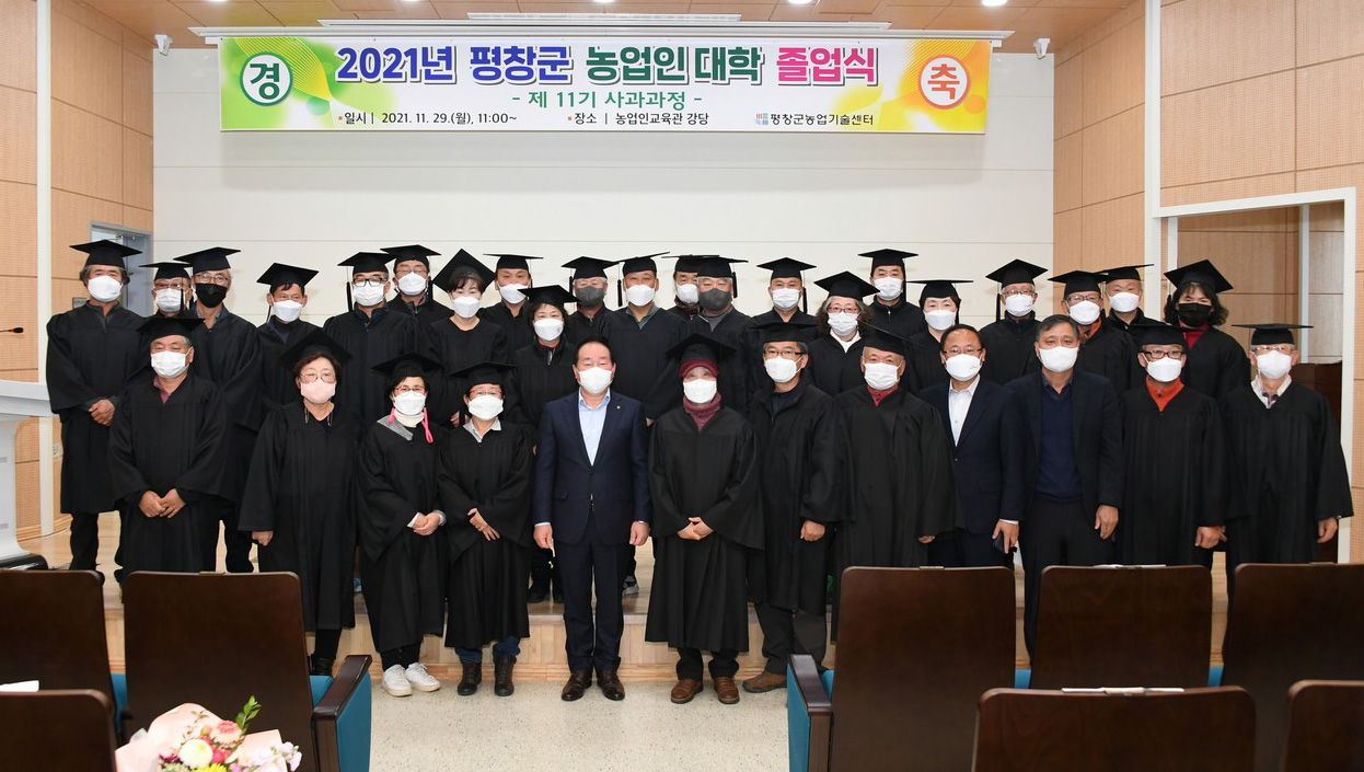 [강원사회복지신문 이정환 기자]=평창군은 지난 11월 29일 평창군농업기술센터에서 2021년 평창군농업인대학 사과과정 졸업식을 개최하였다. 이번 졸업식은 졸업생과 한왕기 평창군수, 이상명 농업기술센터소장 등 30여명이 참석한 가운데, 총 31명의 졸업생에게 졸업장이 수여되었다. 또한 자치회 활동에 기여한 김정수 졸업...