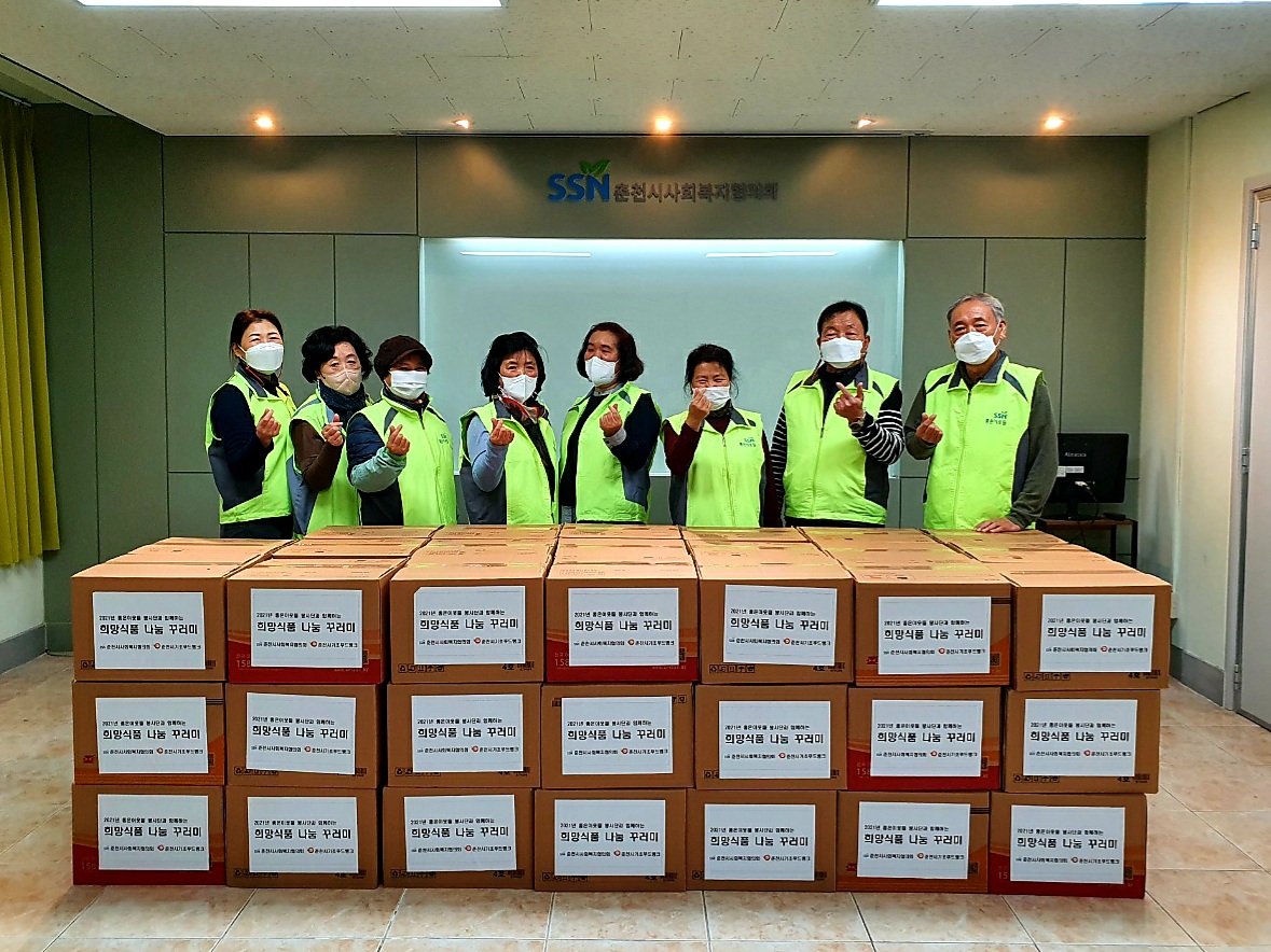 [강원사회복지신문 서은진 기자]=춘천시기초푸드뱅크(뱅크장 신두진)은 지난 11월 30일(화) 본회 회의실에서 좋은이웃들 봉사단과 함께(단장 홍재기)과 함께 지역 내 저소득 가정을 위한 '2021 희망식품나눔 꾸러미' 상자를 제작하여 전달식을 가졌다. 희망식품나눔 꾸러미 지원 사업은 춘천시기초푸드뱅크 후원자와 좋은이웃...