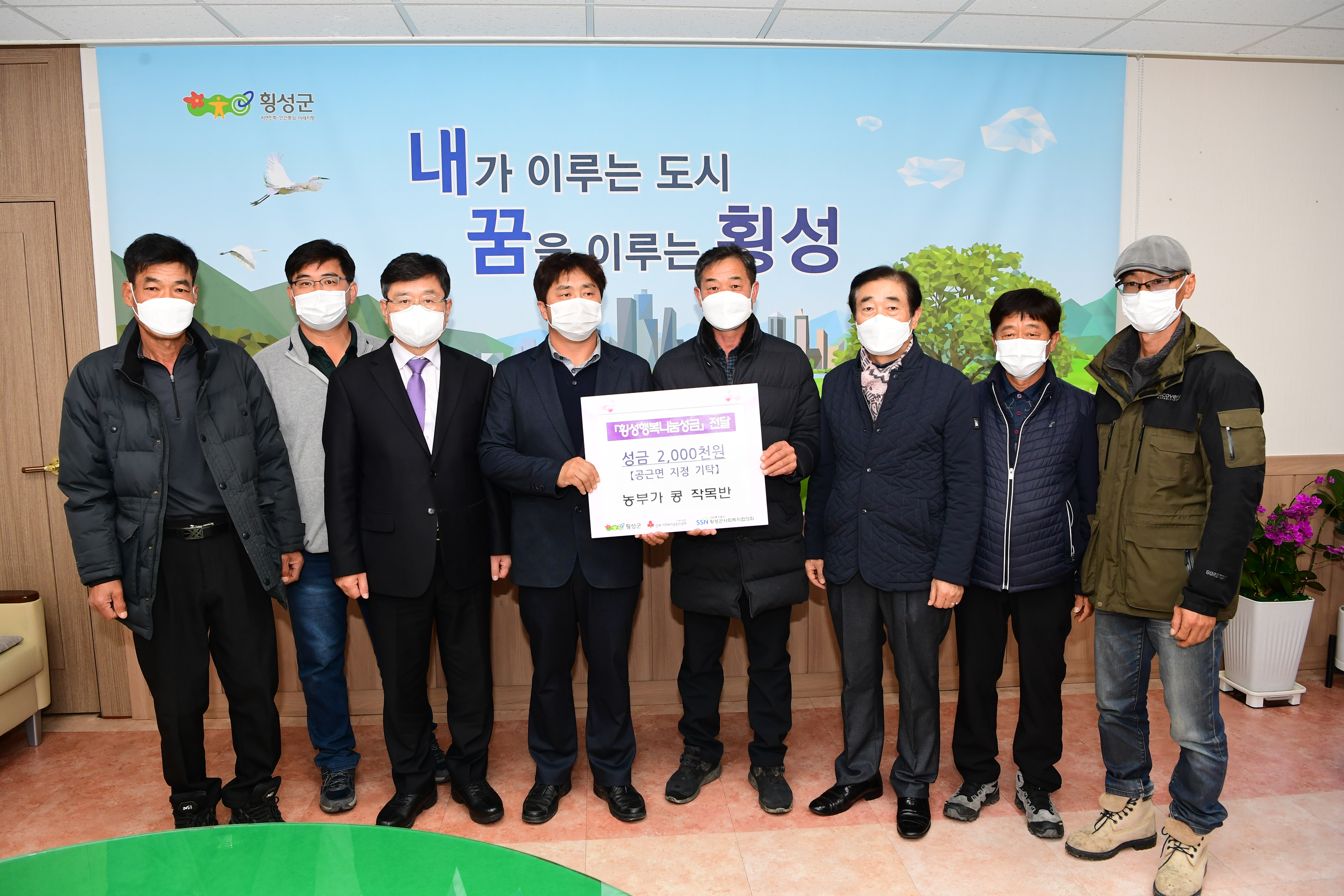 [강원사회복지신문 홍기한 기자]=농부가 '콩' 작목반(회장 한두만)은 지난 11월 30일 오후 4시, 횡성군청 군수 집무실을 방문하여 성금 200만원을 지정기탁했다. 이날 전달식에는 장신상 군수와 이석원 횡성군 사회복지협의회장, 농부가 '콩' 작목반 한두만 회장 외 임원 및 회원 5명이 참석하였다. 2019년 4월 14일 창립한 ...