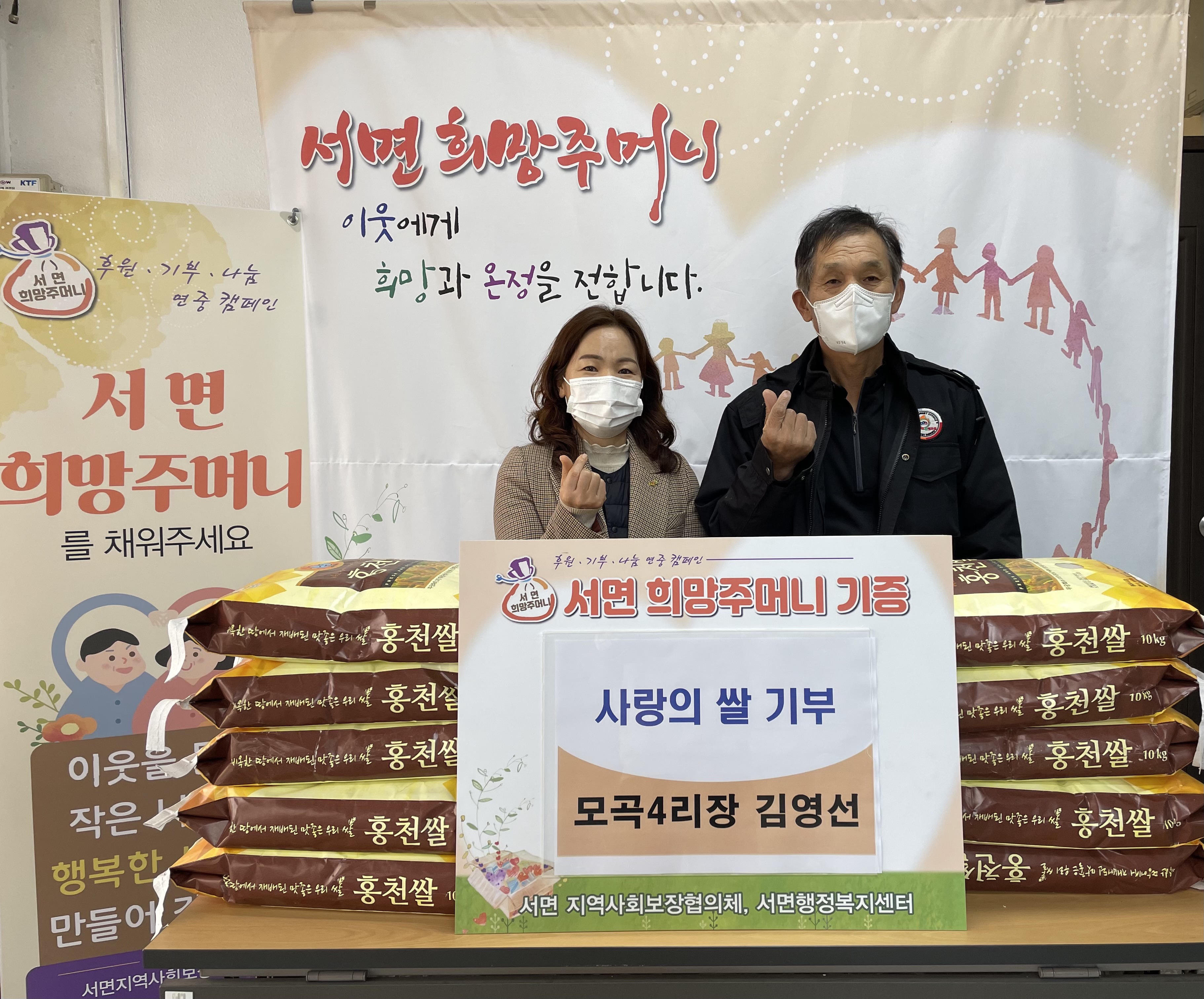 [강원사회복지신문 서은진 기자]=홍천군 서면 모곡4리 김영선 이장은 지난 11월 29일 서면 행정복지센터를 방문, 지역의 어려운 이웃을 돕기 위해 쌀 10포(1포 10kg)를 기부했다. 서면 지역사회보장협의체 위원으로 활동하고 있는 김영선 이장은 매년 어려운 이웃을 위한 기부에 앞장서는 등 지역사회에 귀감이 되고 있다. 김...