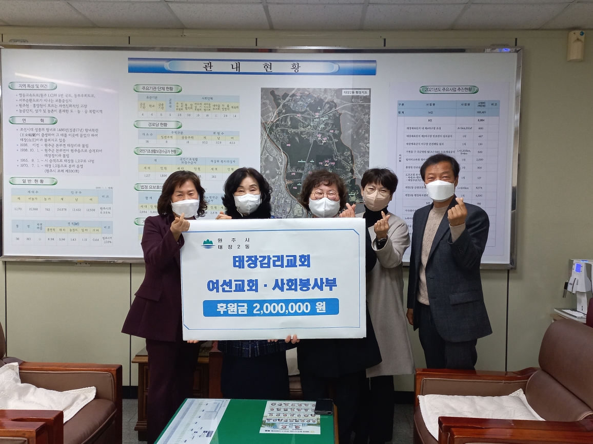 [강원사회복지신문 서은진 기자]=태장감리교회(담임목사 권혁상) 여선교회·사회봉사부는 지난 11월 29일 지역의 어려운 이웃을 돕기 위해 후원금 200만 원을 원주시 태장2동 행정복지센터(동장 정은일)에 전달했다.