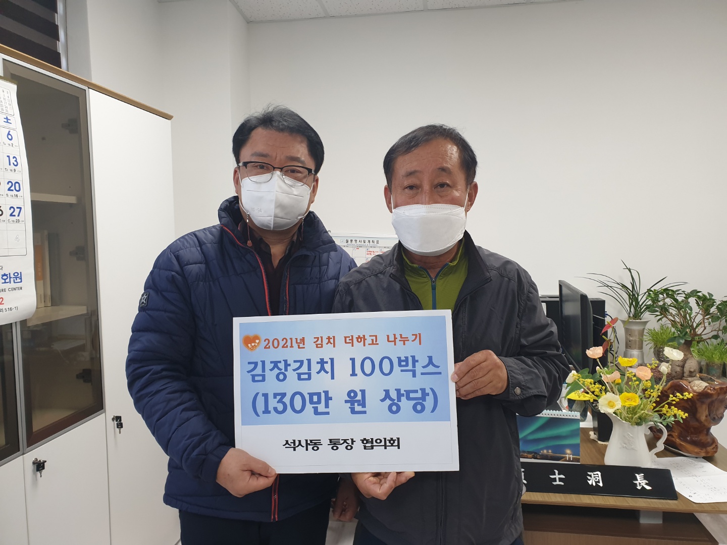 [강원사회복지신문 홍기한 기자]=춘천시 석사동 통장협의회(회장:차규학)는 지난 11월 16일 춘천시 석사동 행정복지센터(동장:김희상)에 김장 김치(130만원 상당)를 기탁했다.