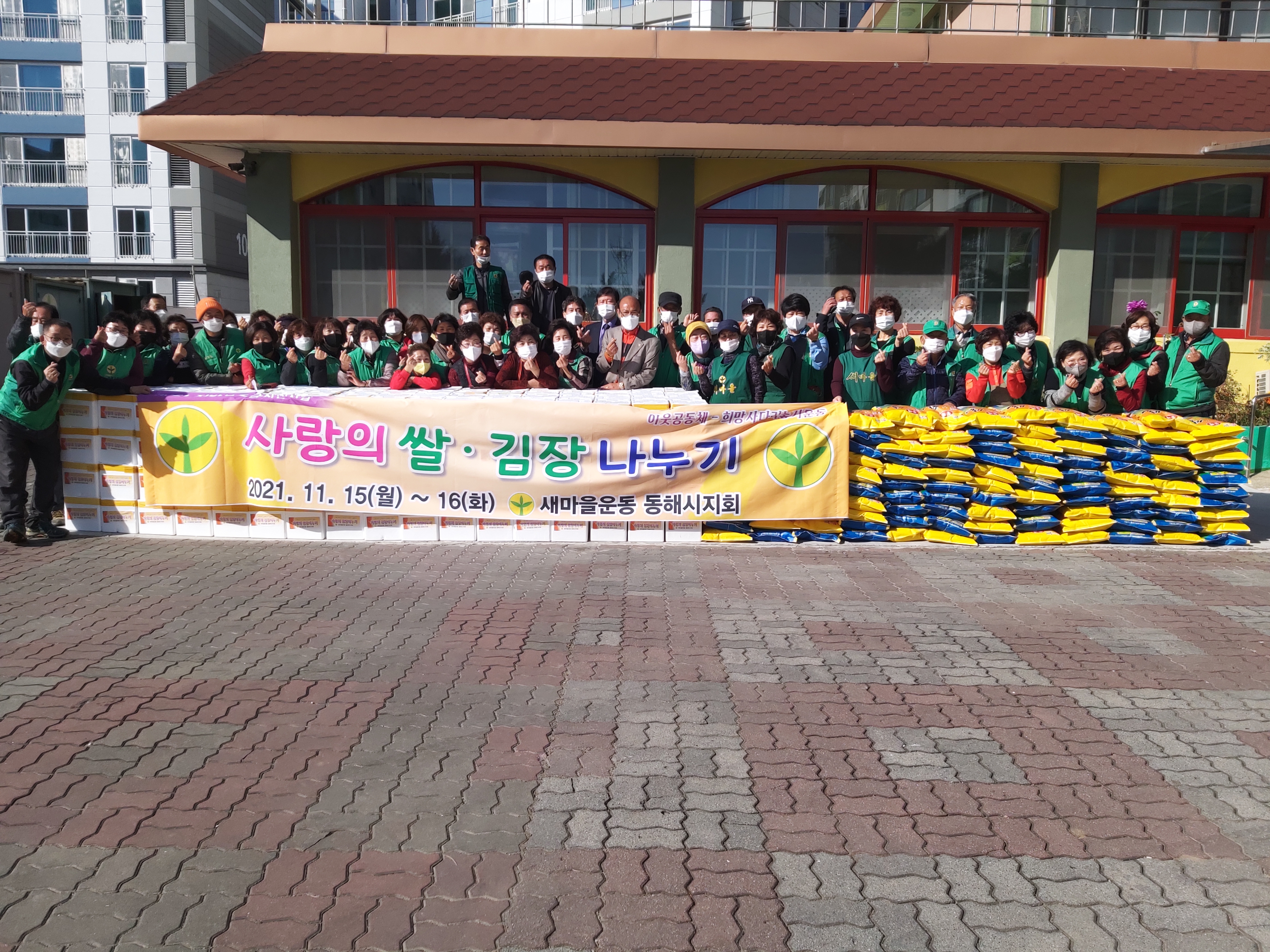 [강원사회복지신문 서은진 기자]=새마을운동 동해시지회 새마을지도자 60여명 참석 새마을운동 동해시지회(지회장 홍순선)가 입동을 맞아 사랑의 쌀·김장 나눔 행사를 지난 11월 15일과 16일 이틀간 동해시새마을지회사무실 앞마당에서 진행했다. 이번 행사는 사회적 거리두기 수칙을 준수하며 홍순선 지회장과 김옥자 새마...