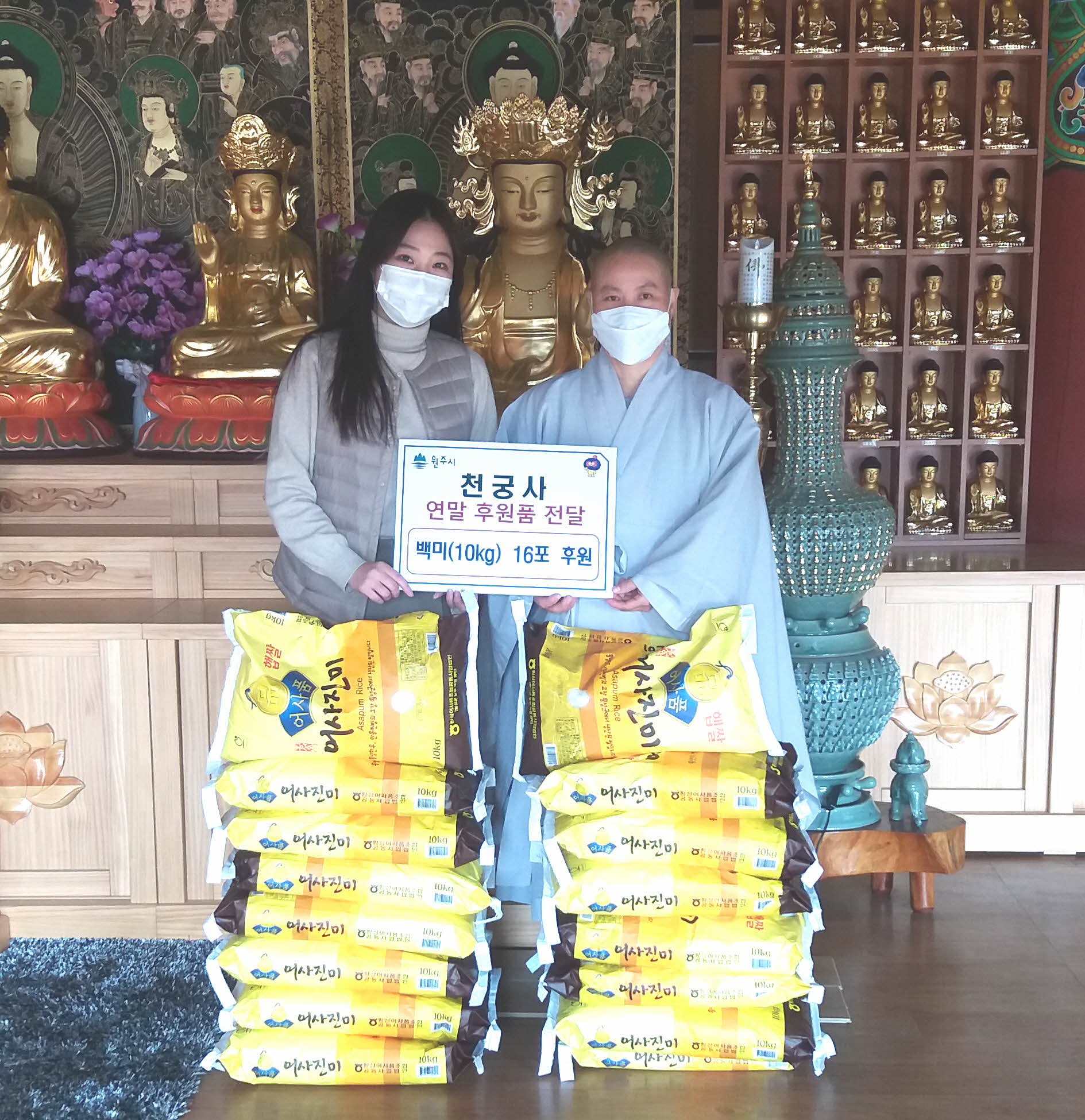[강원사회복지신문 유경수 기자]=원주시 소초면 소재 천궁사(주지 스님 정휴)는 지난 11월 16일 지역 저소득가구를 위한 백미(10kg) 16포를 소초면 행정복지센터(면장 김인수)에 전달했다. 지난 5월에도 백미(10kg) 16포를 후원한 천궁사는 2019년부터 매년 2회 이상 꾸준한 나눔을 이어오고 있다.