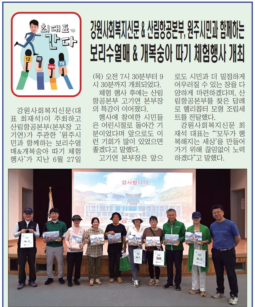 강원사회복지신문(대표 최재석)과 강원사회복지신문 사랑봉사단(회장 이승호)은 지난 5월 19일(일) ‘제22회 원주부부축제’에서 축제장을 방문한 관람객들을 위해 1365 자원봉사릴레이 교통 안전관리 봉사활동을 펼쳤다. 이날 행사에는 원강수 원주시장을 비롯 각계각층의 관계자들이 참석해 ‘제22회 원주부부축제’를 축하...