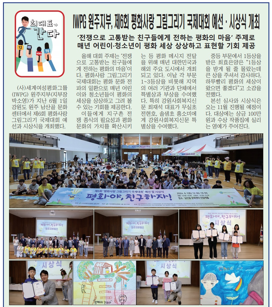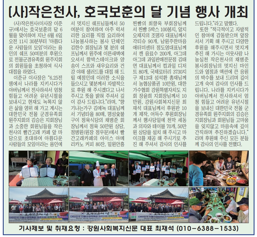 강원사회복지신문(대표 최재석)은 5월 가정의 달을 맞아 지난 5월 7일(화) 하늘그림 카페&뷔페에서 ‘강원사회복지신문은 모두가 행복해지는 세상을 만들어 갑니다’라는 슬로건 아래 ‘제12회 행복한 동행 경로잔치’를 개최하였다. 이날 행사에는 원주시사회복지협의회 박만호 회장, 하늘그림 뷔페 고순임 대표, 강원사...